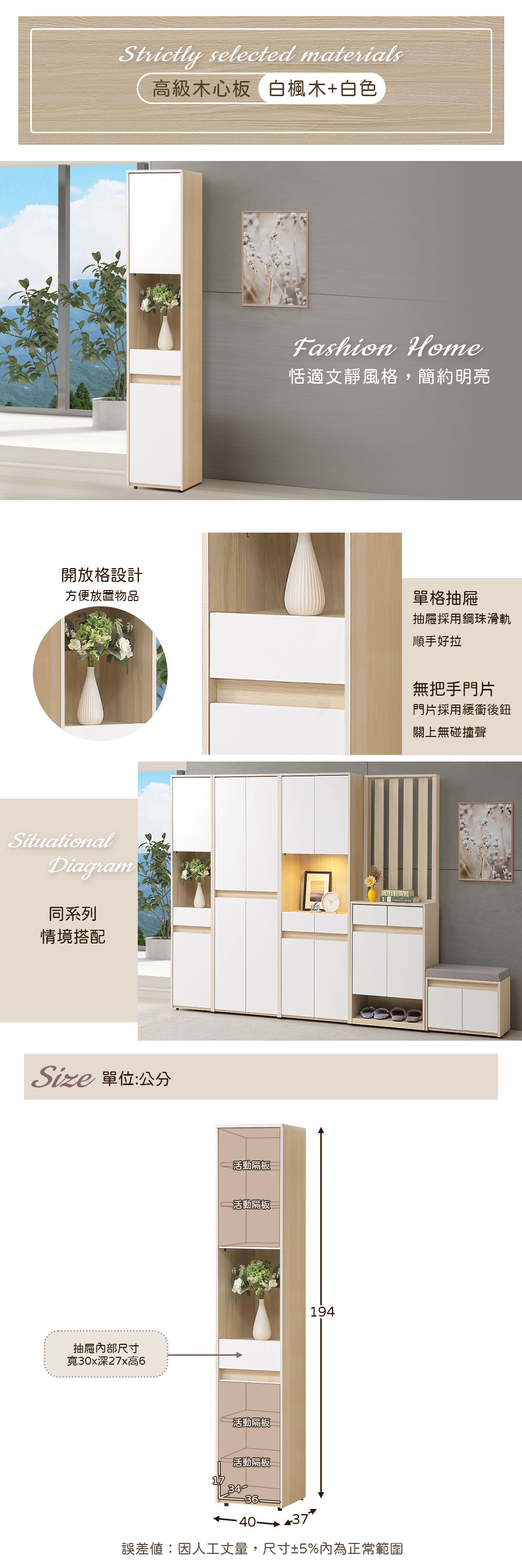 ◆恬適文靜風格,簡約明亮◆單抽屜設計,簡單收納小物◆開放格檯面方便放置◆緩衝後鈕,減少碰撞聲◆免組裝,專人配送到府尺寸:寬 40 x 深 37 x 高 194公分材質:高級木心板顏色:白楓木+白色產地:台灣誤差值:因人工丈量,尺寸±5%內為正常範圍