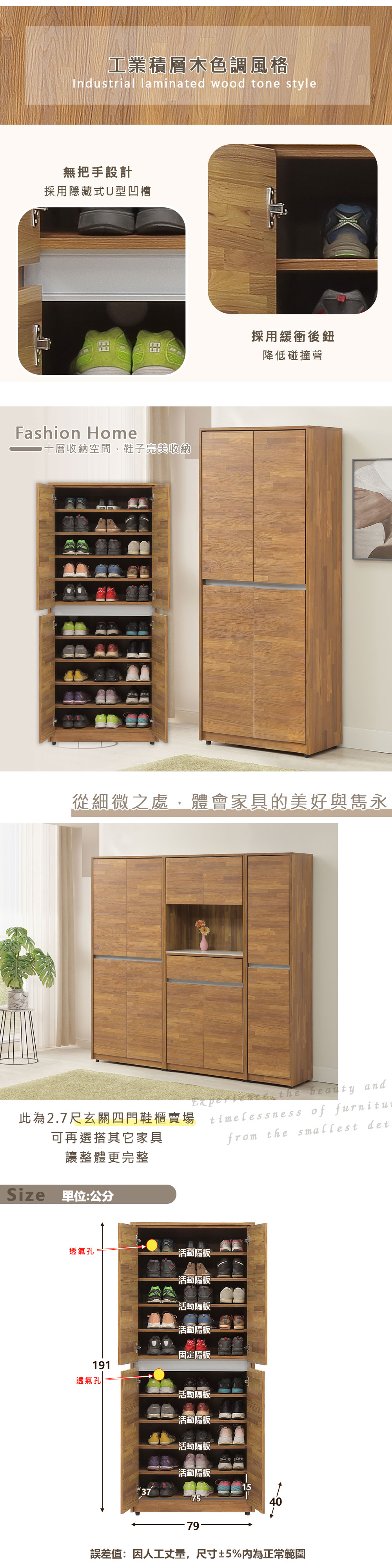 ◆無把手設計,採用隱藏式U型凹槽◆十層收納空間,鞋子完美收納◆採用緩衝後鈕,降低碰撞聲◆工業積層木色調風格◆安心配送,由專人到府組裝尺寸:寬 79 x 深 40 x 高 191 公分材質:高級木心板顏色:積層木色產地:台灣誤差值:因人工丈量,尺寸±5%內為正常範圍