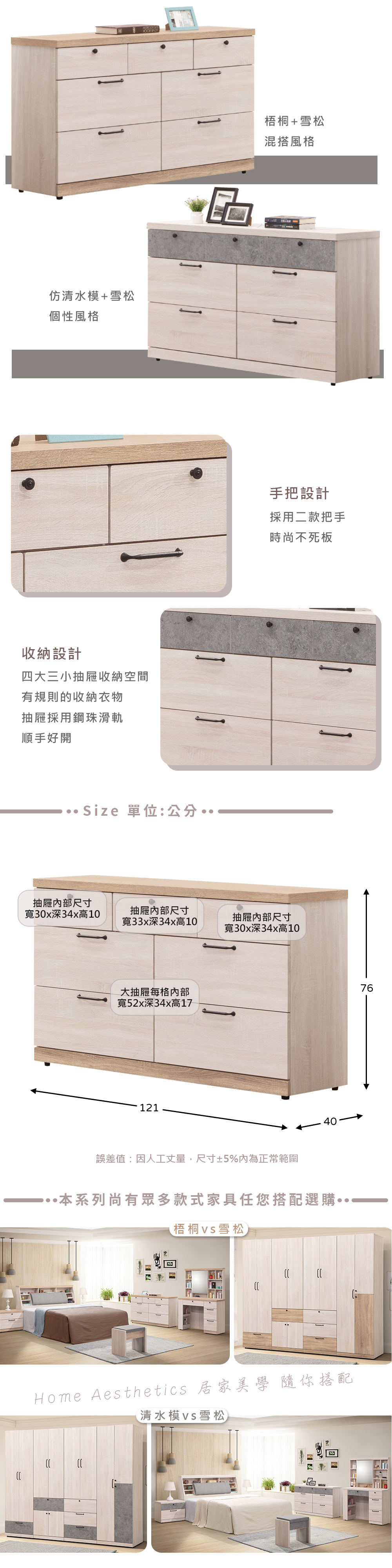 ◆四大三小抽屜收納空間◆質感把手提升家居新格調◆MIT鋼珠滑軌,開闔不費力◆免自行組裝,專人配送到府尺寸:寬 121 x 深 40 x 高 76 公分材質:高級木心板+黑砂鐵件顏色:清水模拼色產地:台灣誤差值:因人工丈量,尺寸±5%內為正常範圍