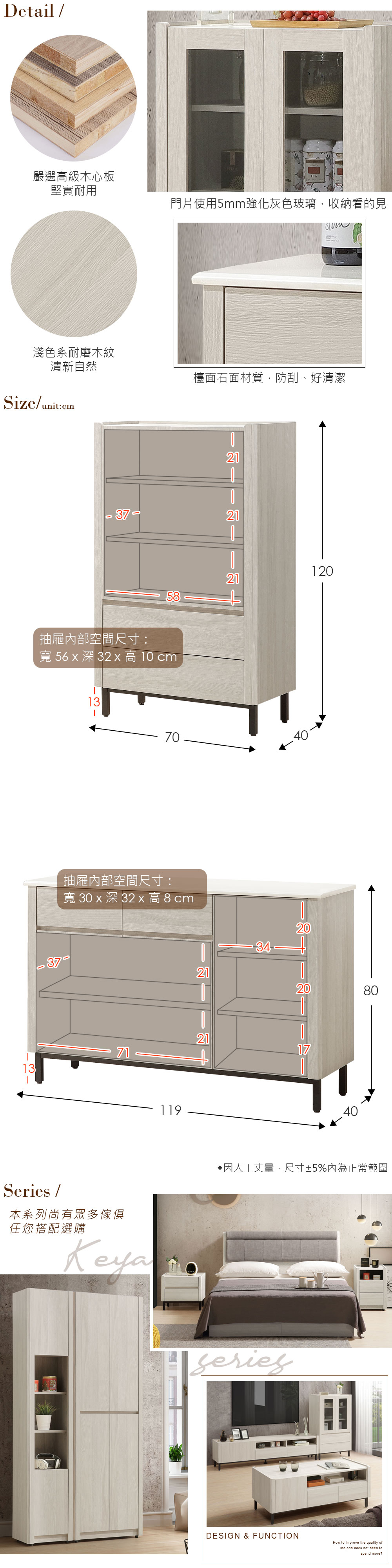 ◆木心板材質,堅實、穩固、耐用◆清新淺色系,質感木紋路視覺◆5mm強化灰色玻璃,美型、微透視感◆餐櫃檯面岩板材質,防刮、耐磨、好清潔◆門片使用緩衝五金,開合安全、避免夾手◆門櫃+抽屜的防塵收納規劃◆免組裝,專人配送到府餐櫃尺寸:寬 119 x 深 40 x 高 80 公分玻璃櫃尺寸:寬 70 x 深 40 x 高 120 公分材質:高級木心板、岩板、5mm強化玻璃、鐵腳顏色:白榆木色產地:台灣誤差值:因人工丈量,尺寸±5%內為正常範圍