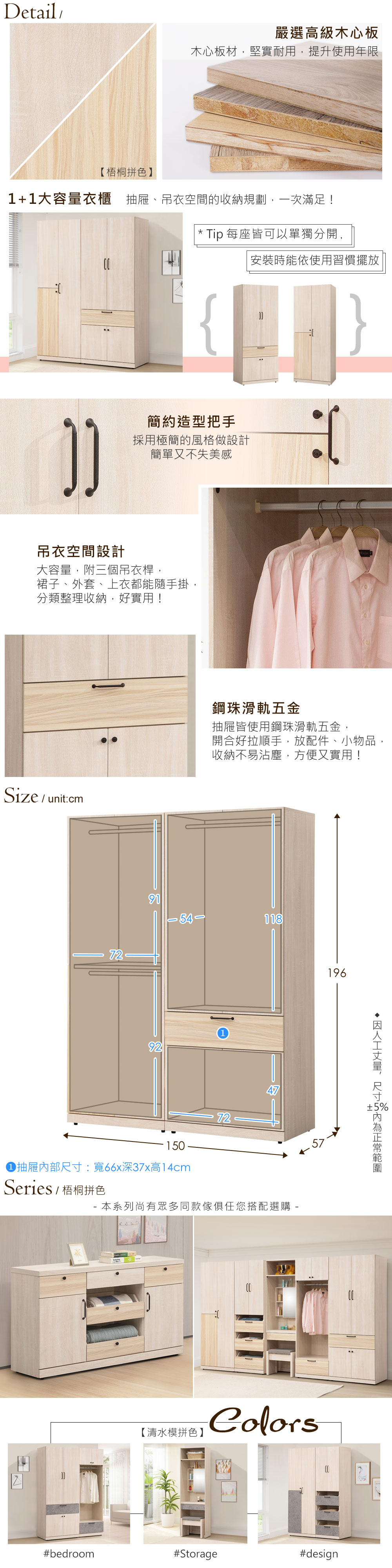 ◆質感雙拼色系,流行時尚◆嚴選高級木心板,堅實耐用◆實用、多元的大容量空間◆免組裝,專人配送到府◆雪松vs.梧桐雙色調風格◆三組吊衣桿+抽屜收納空間尺寸:寬 150 x 深 57 x 高 196 公分材質:高級木心板顏色:梧桐拼色產地:台灣誤差值:因人工丈量,尺寸±5%內為正常範圍