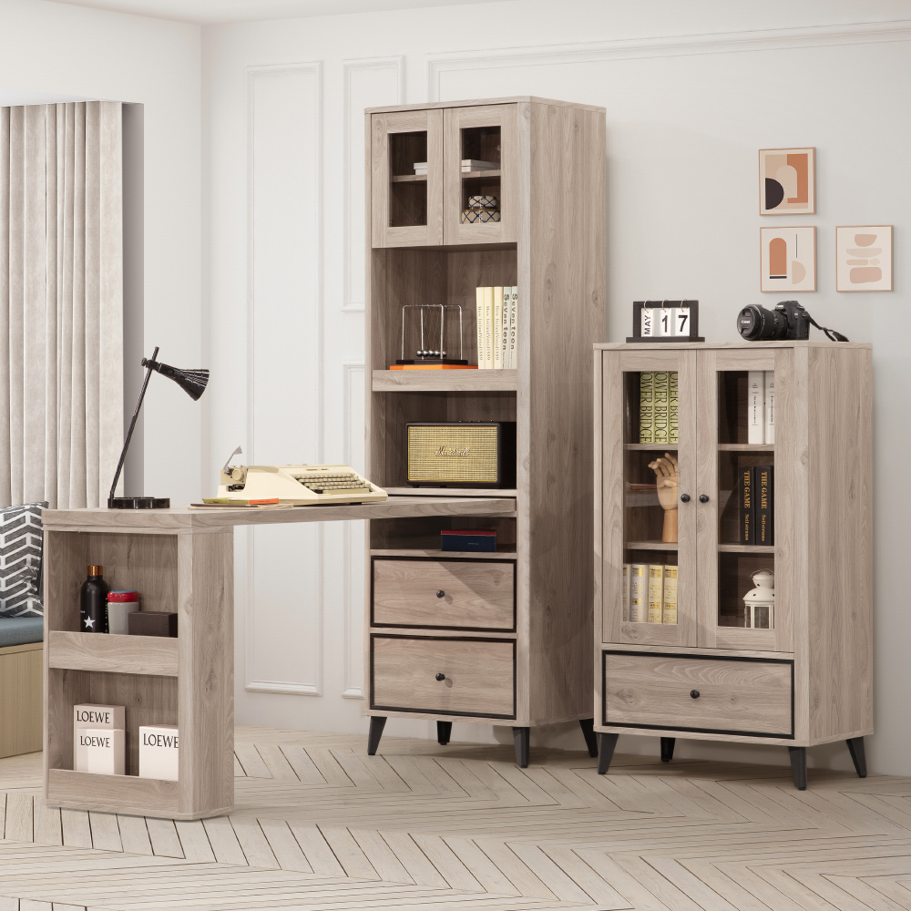 ◆書房家具套裝組合◆斜邊倒角+黑框設計◆鋼珠滑軌,好拉順手◆免組裝,由專人配送到府◆輕工業北歐風格◆書房書桌,也是書櫃,多用途◆玻璃櫃,擺設品一門了然玻璃櫃尺寸:寬 68 x 深 40 x 高 120 公分桌櫃組尺寸:寬 152 x 深 60 x 高 190 公分材質:高級木心板、金屬腳、玻璃顏色:灰橡色產地:台灣誤差值: 因人工丈量,尺寸±5%內為正常範圍