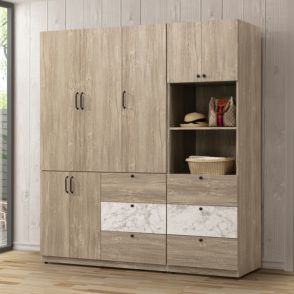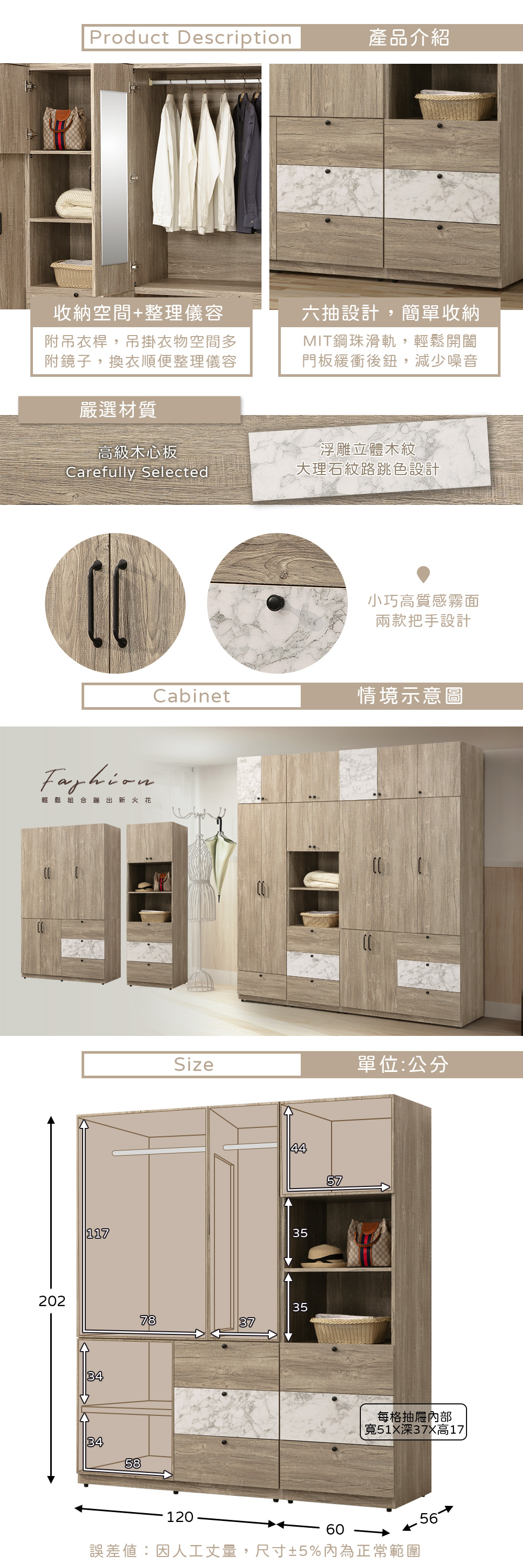 ◆MIT鋼珠滑軌,輕鬆開闔◆門板緩衝後鈕,減少噪音◆附穿衣鏡,方便整理儀容◆免組裝,由專人配送到府◆鄉村、田野梧桐原木風格◆六抽屜+二吊衣桿+開放格設計尺寸:寬 180 x 深 56 x 高 202 公分材質:高級木心板顏色:灰橡木色產地:台灣誤差值:因人工丈量,尺寸±5%內為正常範圍