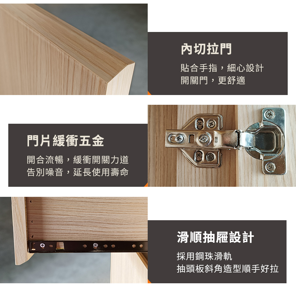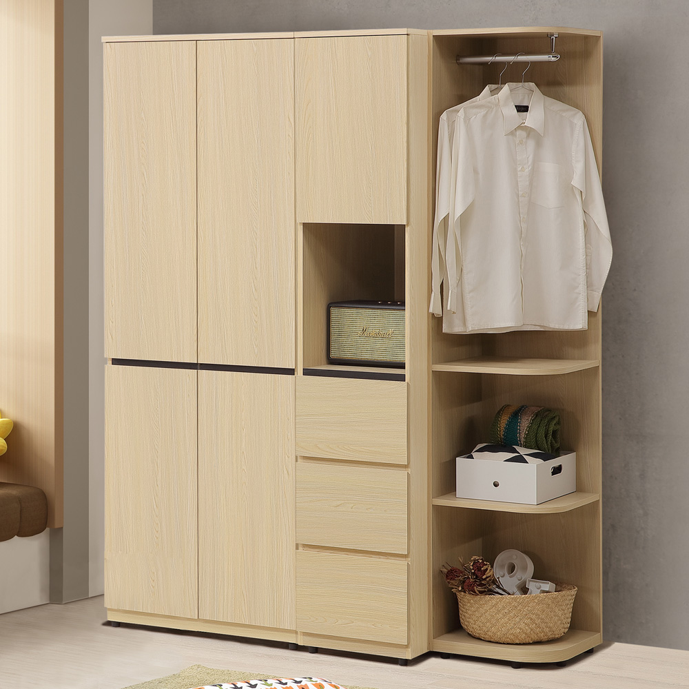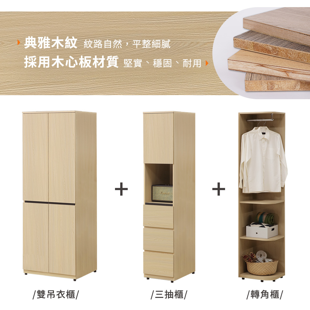 ◆木心板材質,堅實、穩固、耐用◆杉木色系,質感木紋視覺◆門片使用緩衝五金,開合安全◆雙吊桿設計,衣服好掛不易起皺◆開放置物空間,方便隨手拿取◆抽屜鋼珠滑軌設計,使用更順手◆免組裝,專人配送到府尺寸:寬 156 x 深 57 x 高 190 公分材質:高級木心板顏色:杉木色產地:台灣誤差值:因人工丈量,尺寸±5%內為正常範圍