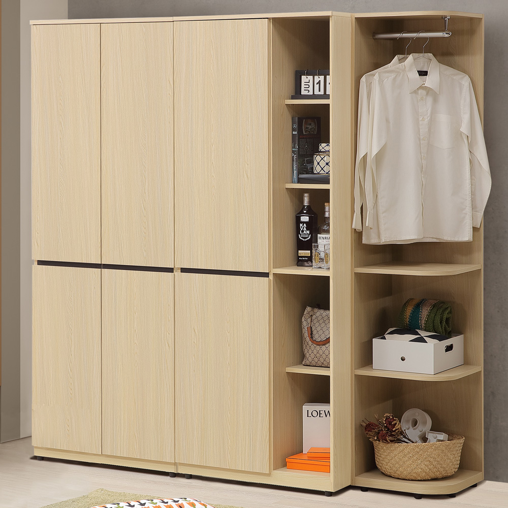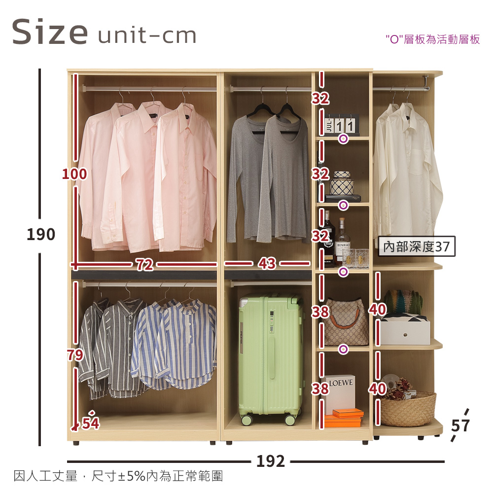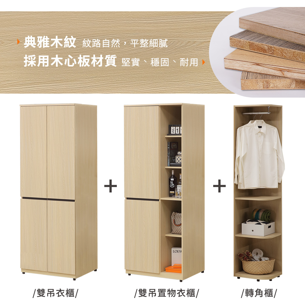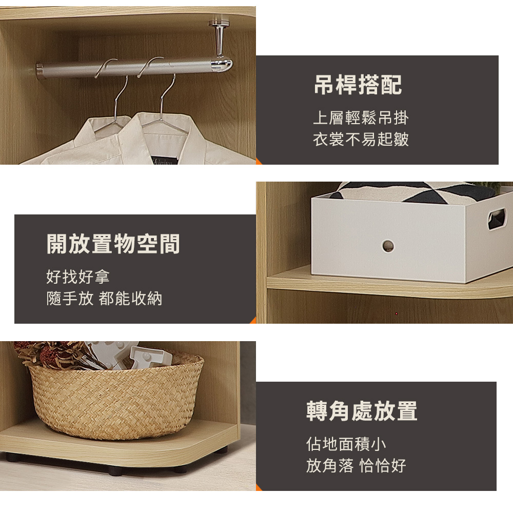 ◆木心板材質,堅實、穩固、耐用◆杉木色系,質感木紋視覺◆門片使用緩衝五金,開合安全◆雙吊桿設計,衣服好掛不易起皺◆開放置物空間,方便隨手拿取◆免組裝,專人配送到府尺寸:寬 192 x 深 57 x 高 190 公分材質:高級木心板顏色:杉木色產地:台灣誤差值:因人工丈量,尺寸±5%內為正常範圍
