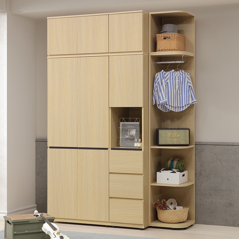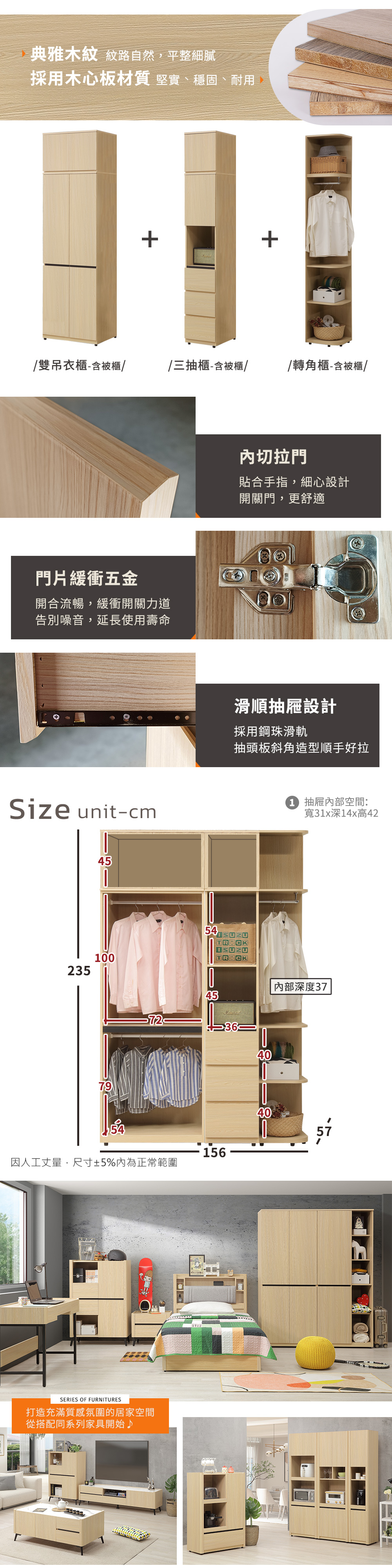 ◆木心板材質,堅實、穩固、耐用◆杉木色系,質感木紋視覺◆門片使用緩衝五金,開合安全◆雙吊桿設計,衣服好掛不易起皺◆開放置物空間,方便隨手拿取◆抽屜鋼珠滑軌設計,使用更順手◆增加上層被櫃空間,收納升級◆免組裝,專人配送到府尺寸:寬 156 x 深 57 x 高 235 公分材質:高級木心板顏色:杉木色產地:台灣誤差值:因人工丈量,尺寸±5%內為正常範圍