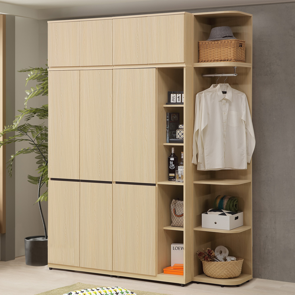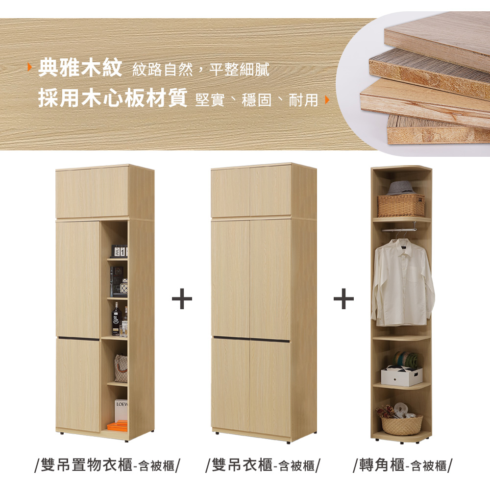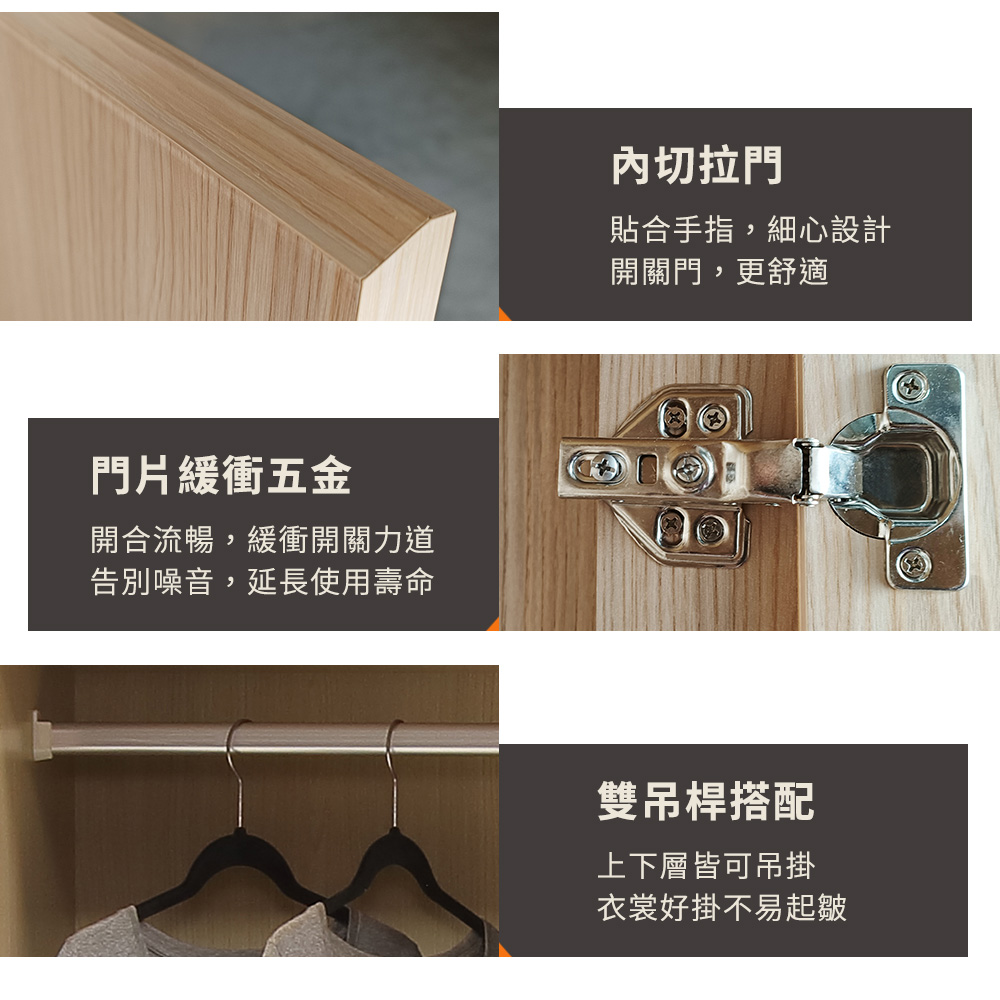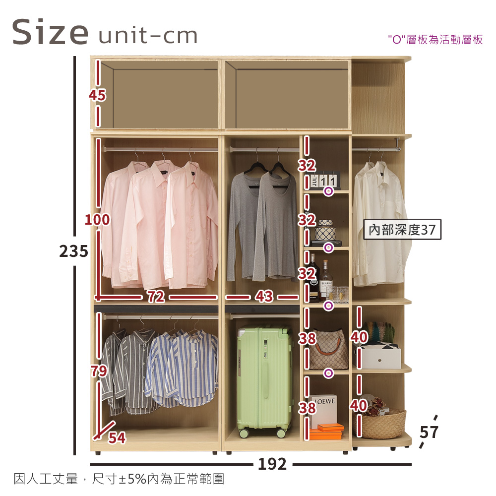 ◆木心板材質,堅實、穩固、耐用◆杉木色系,質感木紋視覺◆門片使用緩衝五金,開合安全◆雙吊桿設計,衣服好掛不易起皺◆開放置物空間,方便隨手拿取◆免組裝,專人配送到府◆增加上層被櫃空間,收納升級尺寸:寬 192 x 深 57 x 高 235 公分材質:高級木心板顏色:杉木色產地:台灣誤差值:因人工丈量,尺寸±5%內為正常範圍