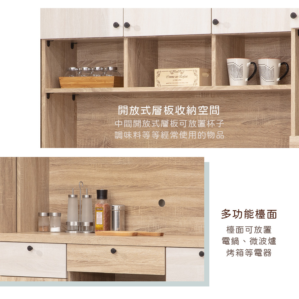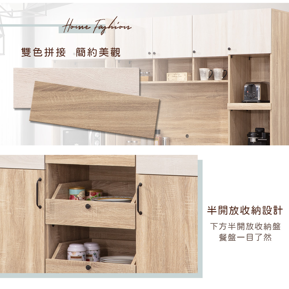 ◆雙色拼接,簡約美觀◆三件組合,可以需求更換位置◆半開放收納盤,餐具一目了然◆免自行組裝,專人配送到府◆廚房、餐廳收納好幫手◆可當餐櫃、高櫃、電器收納櫃、廚櫃◆六拉盤+七抽屜收納尺寸:寬 221 x 深 40 x 高 201 公分材質:高級木心板顏色:梧桐+雪松色產地:台灣誤差值:因人工丈量,尺寸±5%內為正常範圍