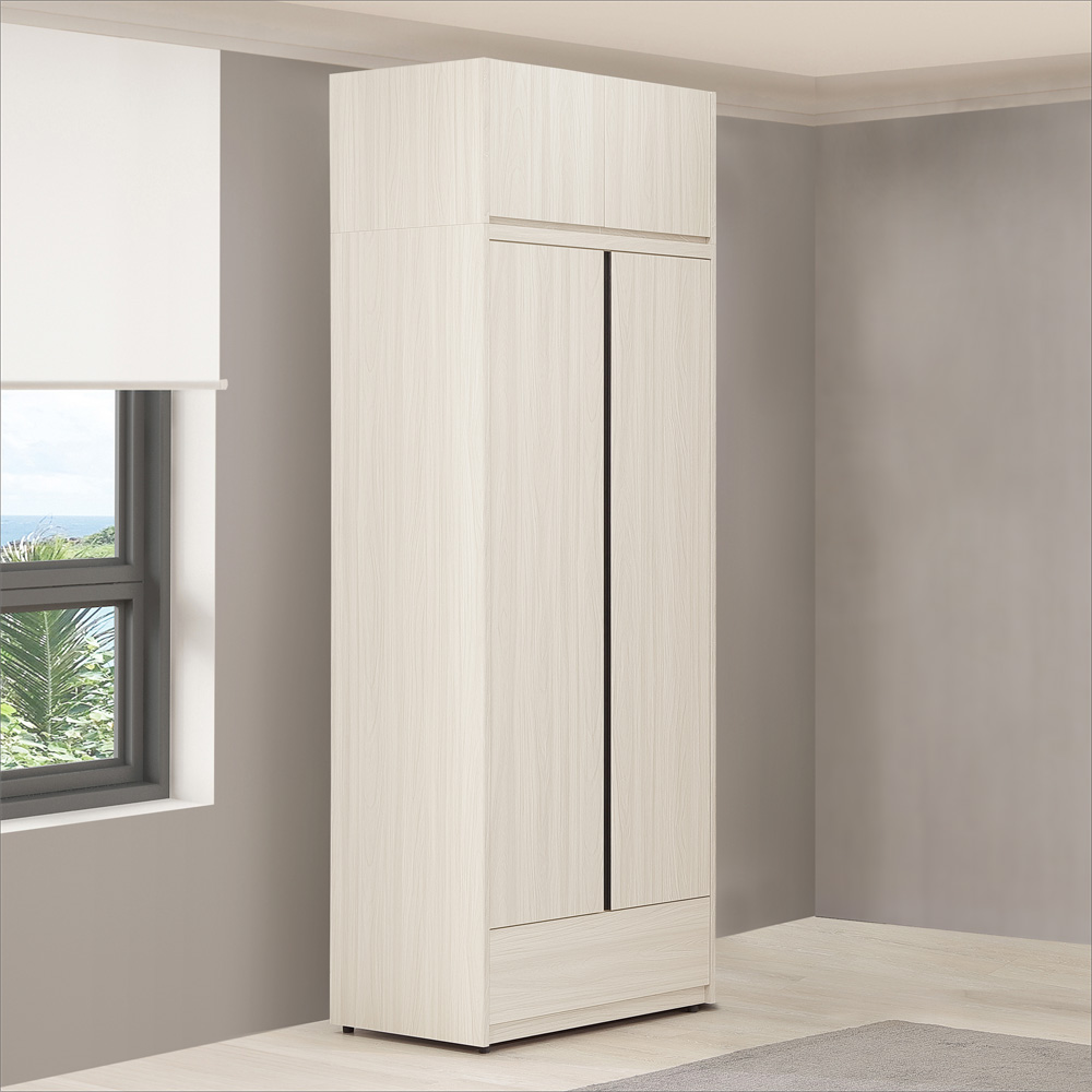◆白榆現代、英倫風格◆吊桿設計,讓您衣物不皺摺◆下方抽屜,折疊衣物好收納◆增加被櫃空間,上層空間不浪費◆免自行組裝,專人配送到府尺寸:寬 80 x 深 57 x 高 242 公分材質:高級木心板顏色:白榆木色產地:台灣誤差值: 因人工丈量,尺寸±5%內為正常範圍