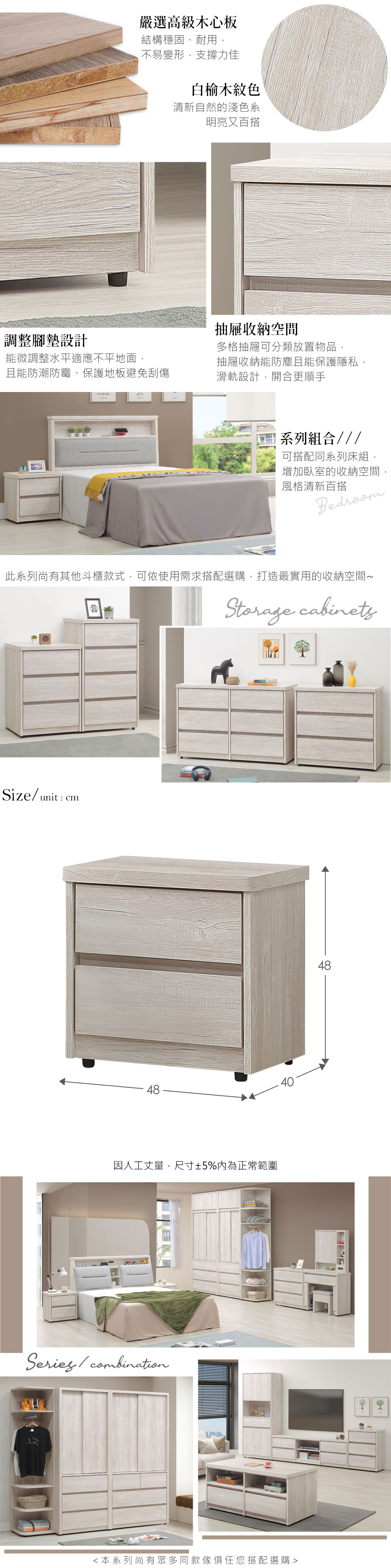 ◆木心板材質,堅實、穩固、耐用◆清新淺色系,質感木紋路視覺◆無把手設計,極簡美觀◆抽屜設計,分類物品、收納防塵◆可搭配床組使用,增加臥室收納空間◆免組裝,由專人宅配到府尺寸:寬 48 x 深 40 x 高 48 公分材質:高級木心板顏色:白榆木色產地:台灣誤差值:因人工丈量,尺寸±5%內為正常範圍