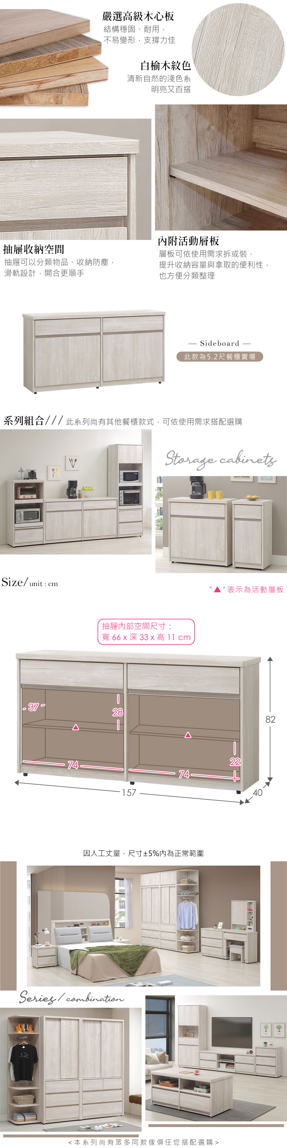 ◆木心板材質,堅實、穩固、耐用◆清新淺色系,質感木紋路視覺◆無把手設計,極簡美觀◆門櫃+抽屜的防塵收納規劃◆內附活動層板,可依需求拆、裝◆免組裝,由專人宅配到府尺寸:寬 157 x 深 40 x 高 82 公分材質:高級木心板顏色:白榆木色產地:台灣誤差值:因人工丈量,尺寸±5%內為正常範圍