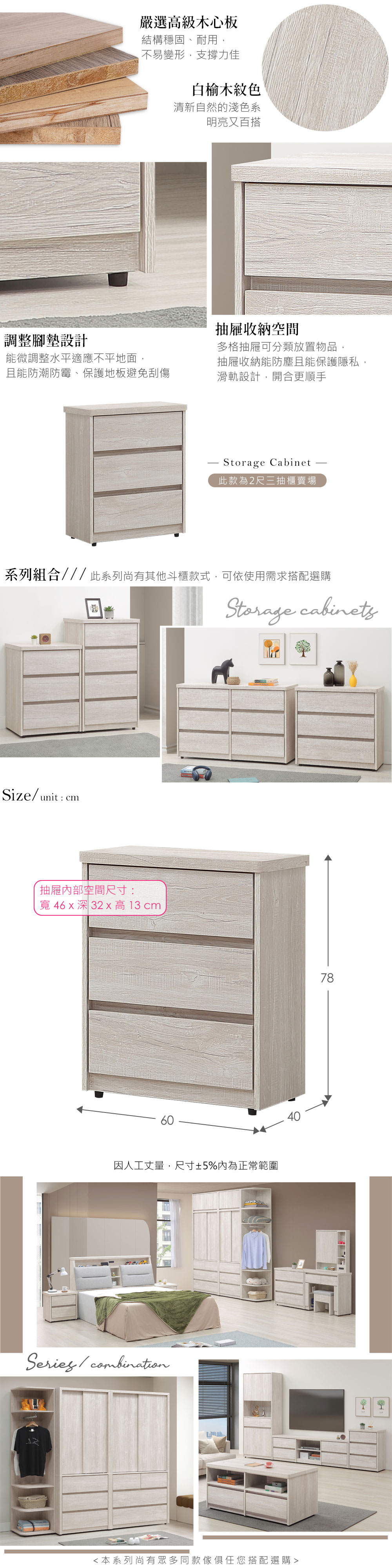 ◆木心板材質,堅實、穩固、耐用◆清新淺色系,質感木紋路視覺◆無把手設計,極簡美觀◆抽屜設計,收納防塵且能保護隱私◆三大抽屜空間,分類物品更整齊◆免組裝,由專人宅配到府尺寸:寬 60 x 深 40 x 高 78 公分材質:高級木心板顏色:白榆木色產地:台灣誤差值:因人工丈量,尺寸±5%內為正常範圍