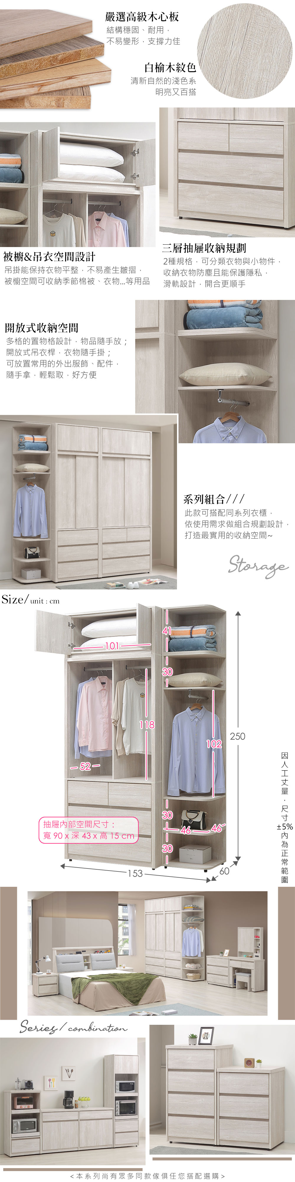 ◆木心板材質,堅實、穩固、耐用◆清新淺色系,質感木紋路視覺◆推門式設計,節約空間◆雙吊衣桿,方便吊掛衣物◆下方抽屜空間,能分類衣物、收納防塵◆側邊開放式轉角櫃,方便隨手掛、隨手取◆上方被櫃收納空間,容量升級◆免組裝,由專人宅配到府尺寸:寬 153 x 深 60 x 高 250 公分材質:高級木心板顏色:白榆木色產地:台灣誤差值:因人工丈量,尺寸±5%內為正常範圍