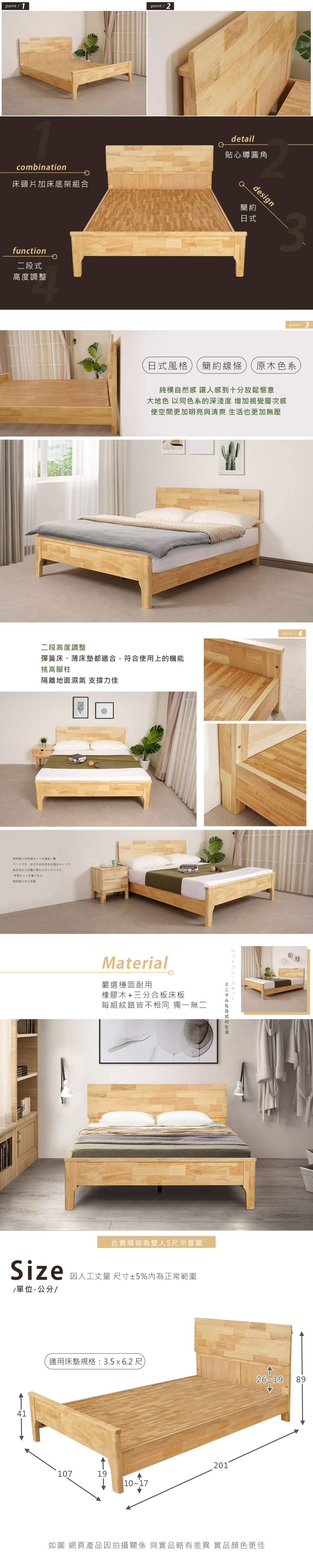 ◆嚴選穩固耐用橡膠木◆自然大地色原木色調◆日式風格,清新簡約◆挑高腳柱,支撐力佳◆床架二段式高度調整◆床頭片加床底架組合◆免組裝專人配送到府整組配件:3.5尺床頭片 + 3.5尺床架 (不含床墊)尺寸:長 201 x 寬 107 x 高 89 公分材質:橡膠木+三分合板床板顏色:原木色產地:中國適用床墊規格:3.5 x 6.2尺誤差值:因人工丈量,尺寸±5%內為正常範圍