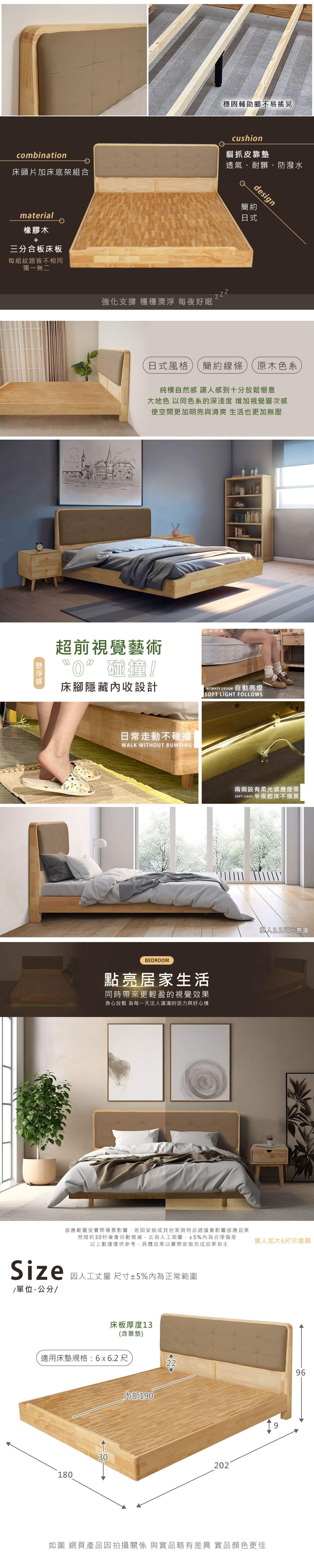 ◆懸浮設計,會發光的床◆床腳內收,打造懸浮感◆兩側設有柔光感應燈帶◆感應式光源半夜不摸黑◆漂浮床,超前視覺藝術◆嚴選穩固耐用的橡膠木◆耐磨、防刮貓抓皮靠墊◆自然大地色系原木色系◆日式風格,清新簡約感◆免組裝由專人配送到府整組配件:6尺床頭片 + 6尺床架 (不含床墊)尺寸:長 202 x 寬 180 x 高 96 公分材質:貓抓皮、橡膠木、三分合板床板顏色:原木色產地:中國適用床墊規格:6 x 6.2尺誤差值:因人工丈量,尺寸±5%內為正常範圍