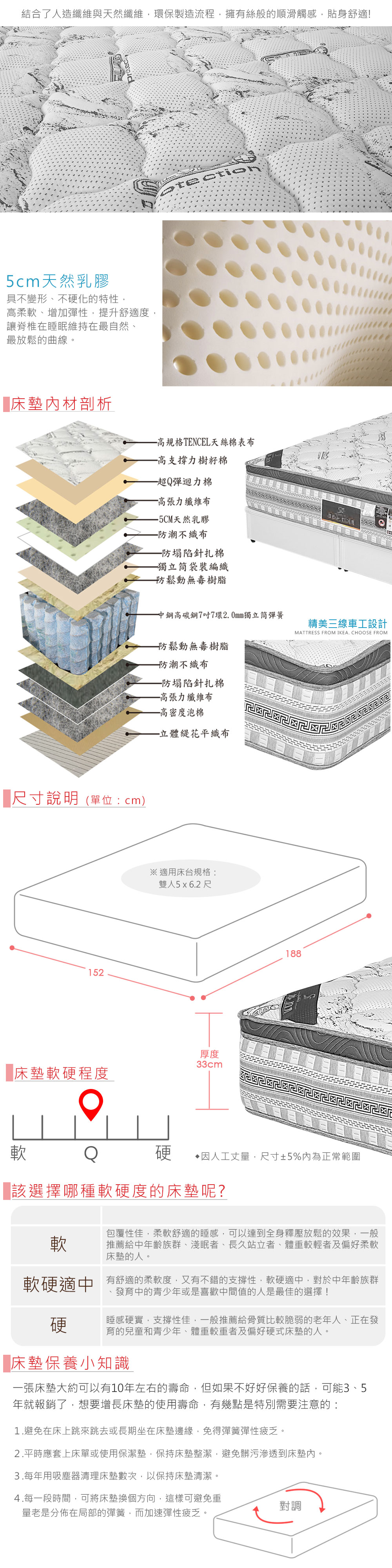 ◆5cm高柔軟天然乳膠◆天絲棉質感舒柔表布◆專人配送,到府安裝◆TENCEL天絲棉表布◆2.0mm中鋼高碳鋼獨立筒◆床墊軟硬度:偏Q◆厚度33公分整組配件:床墊 x1(不含床台)尺寸:寬 152 x 長 188 x 厚 33 公分材質說明:第一層-高規格TENCEL天絲棉表布第二層-高支撐樹籽棉第三層-超Q彈迴力棉第四層-高張力纖維布第五層-5cm天然乳膠第六層-防潮不織布第七層-防塌陷針扎棉第八層-獨立筒袋裝編織第九層-防鬆動無毒樹脂第十層-中鋼高碳鋼7吋7環2.0mm獨立筒彈簧第十一層-防鬆動無毒樹脂第十二層-防潮不織布第十三層-防塌陷針扎棉第十四層-高張力纖維布第十五層-高密度泡棉第十六層-立體緹花平織布產地:台灣誤差值:因人工丈量,尺寸±5%內為正常範圍