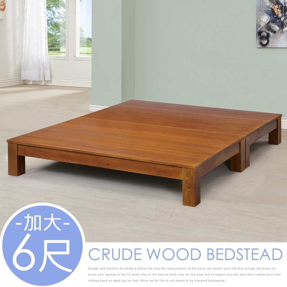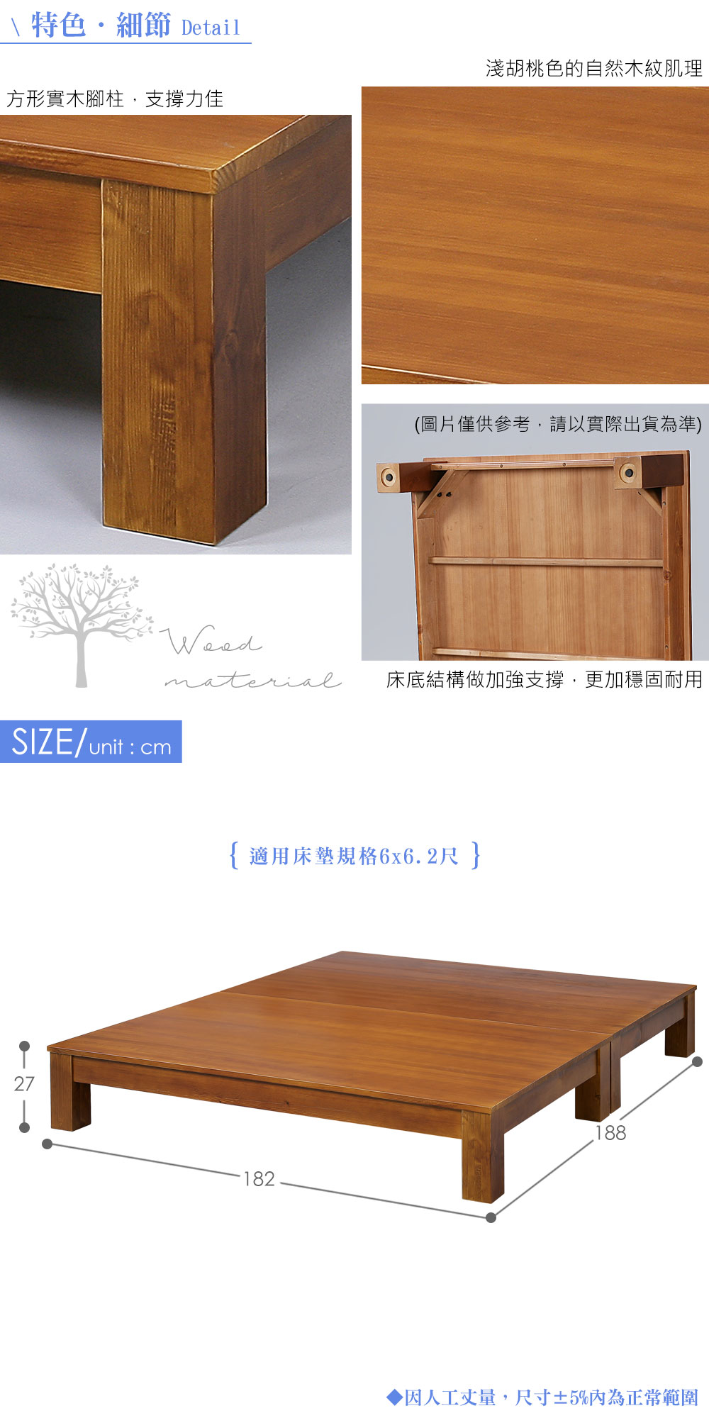 ◆嚴選松木實木材質◆結構設計穩固耐用◆免組裝,專人送到府◆日式、田園系風格◆溫馨實木質感臥室◆床架高度27公分尺寸:寬 182 x 深 188 x 高 27 公分 (床下高度16公分)適用床墊規格:6 x 6.2 尺材質:松木實木顏色:淺胡桃色產地:台灣誤差值:因人工丈量,尺寸±5%內為正常範圍