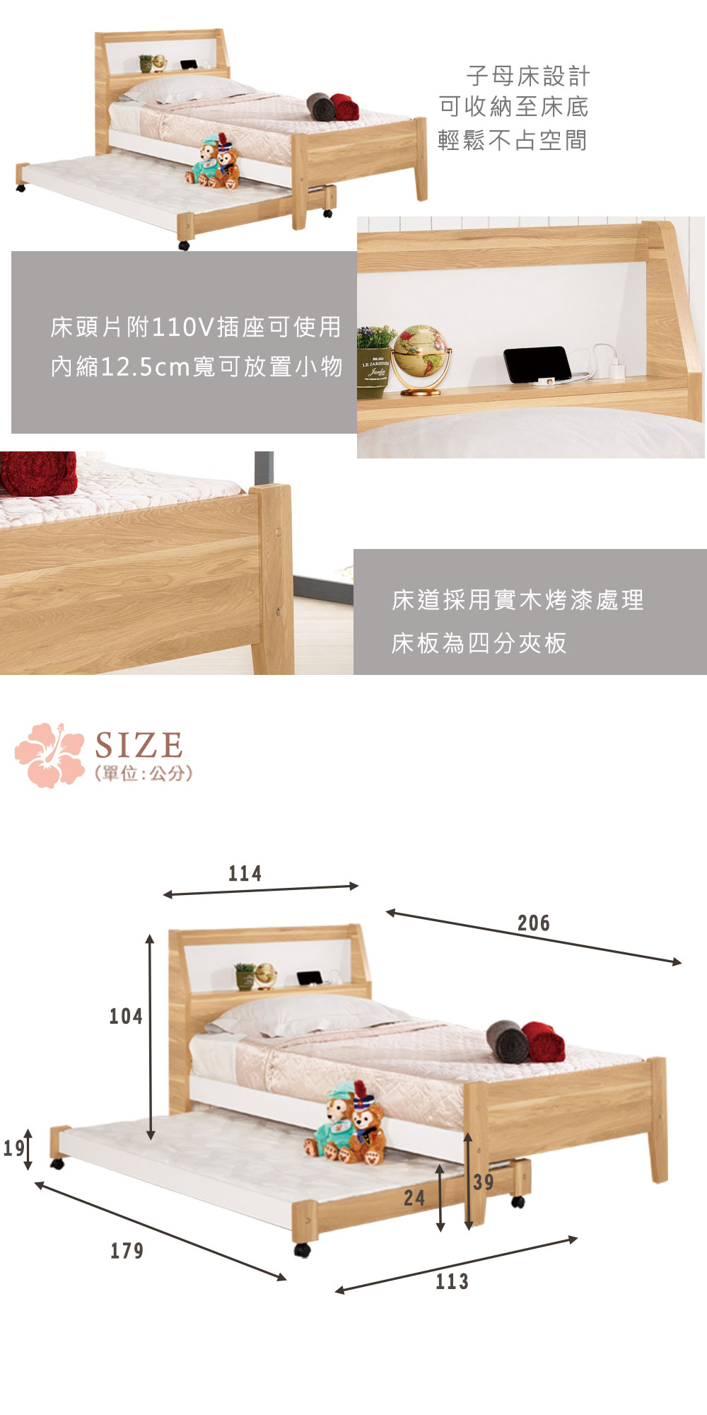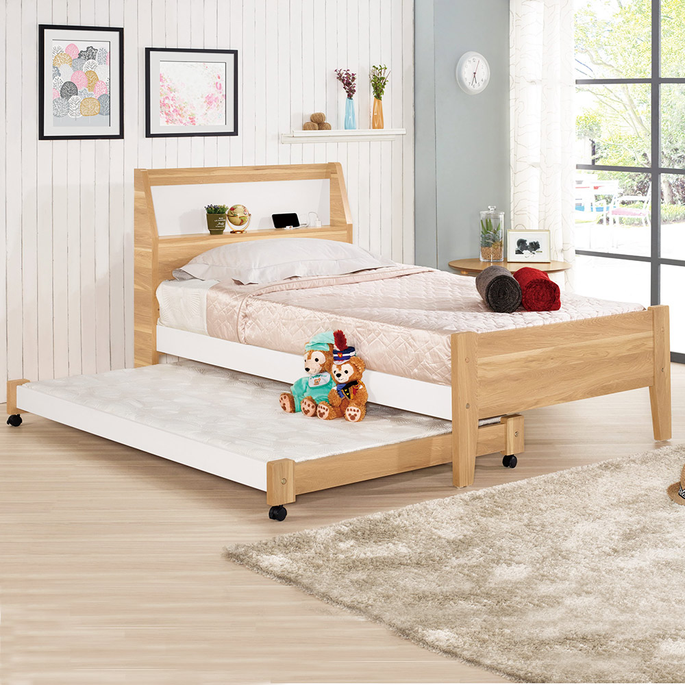 ◆床頭片附插座孔,充電更省力◆子母床設計,訪客來訪也不怕◆耐磨立體觸感,浮調壓紋設計◆免自行組裝,專人配送到府◆日式、北歐風格◆多功能床組適合小型臥室空間尺寸: 單人床:寬 114 x 深 206 x 高 104 公分 子床:寬 113 x 深 178.5 x 高 19 公分 (內部寬103x深170公分)材質:高級木心板+四分正夾板顏色:原木色產地:台灣誤差值:因人工丈量,尺寸±5%內為正常範圍