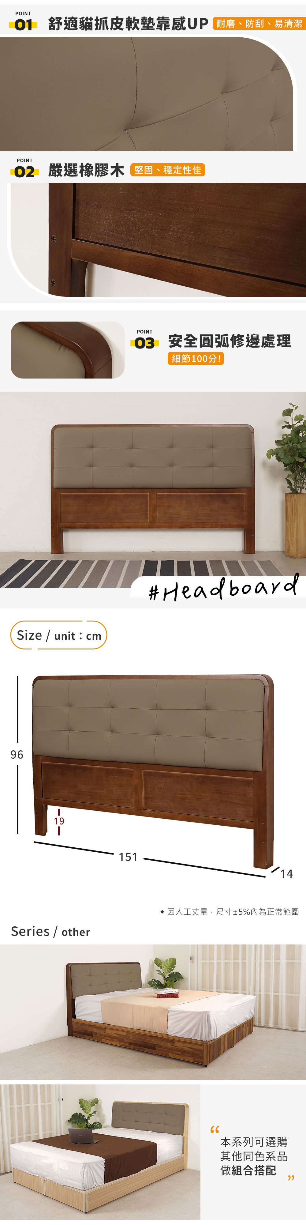 ◆嚴選穩固耐用的橡膠木◆耐磨、防刮貓抓皮靠墊◆日式風格,清新簡約感◆免組裝由專人配送到府整組配件:5尺床頭片尺寸:寬 151 x 厚 14 x 高 96 公分材質:貓抓皮、橡膠木顏色:胡桃色產地:中國誤差值:因人工丈量,尺寸±5%內為正常範圍