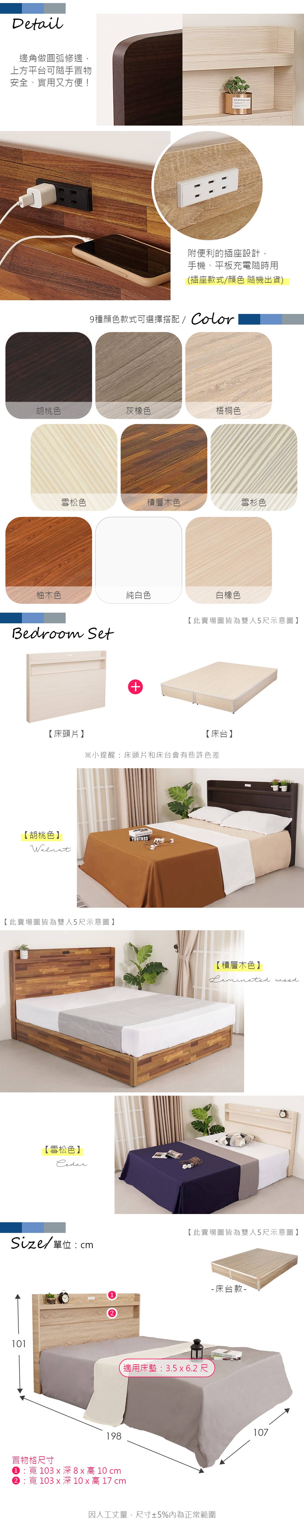 ◆木心板材質,堅實耐用◆附有插座,充電超方便◆床組多色可選,好搭配◆免組裝,專人宅配到府◆床頭片+床台整組商品:3.5尺床頭片 + 3.5尺床台(不含床墊)尺寸:寬 107 x 深 198 x 高 101 公分適用床墊:3.5 x 6.2 尺材質:高級木心板、三分夾板顏色:梧桐色產地:台灣誤差值:因人工丈量,尺寸±5%內為正常範圍