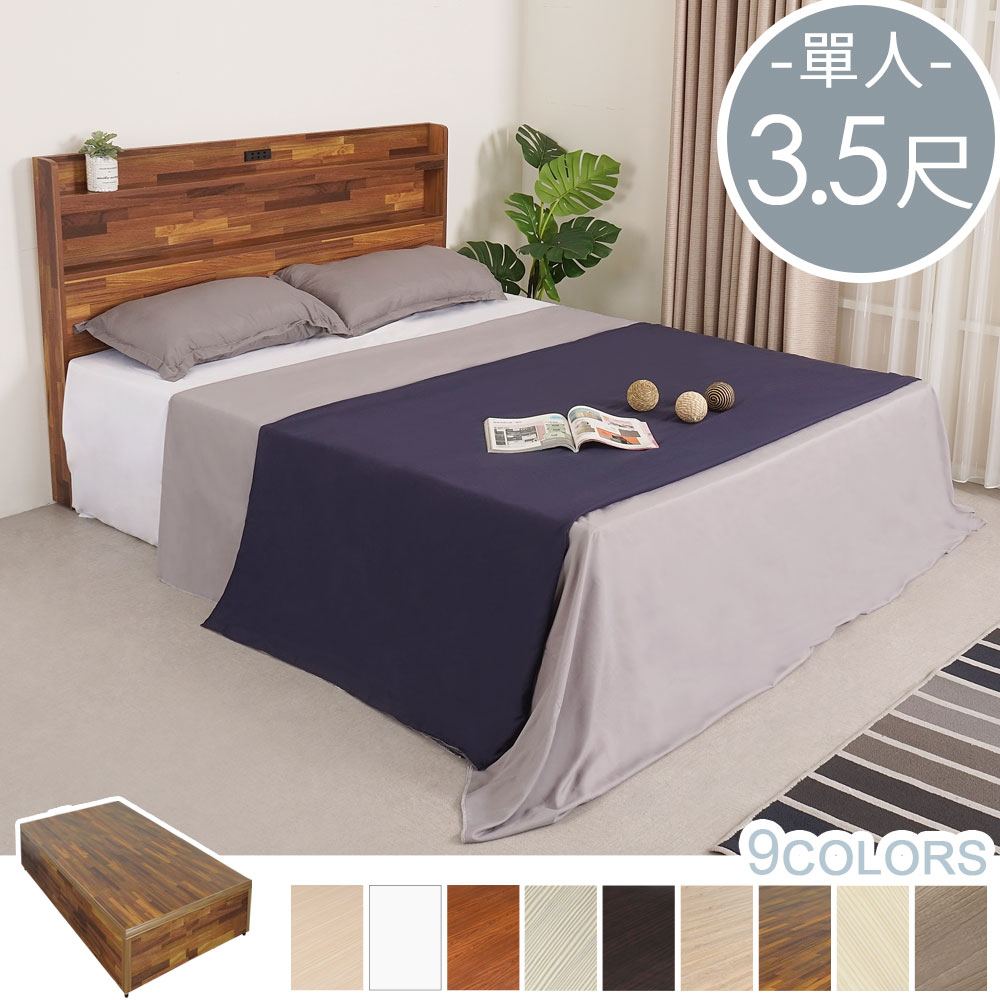 ◆木心板材質,堅實耐用◆附有插座,充電超方便◆床組多色可選,好搭配◆免組裝,專人宅配到府◆床頭片+床台整組商品:3.5尺床頭片 + 3.5尺床台(不含床墊)尺寸:寬 107 x 深 198 x 高 101 公分適用床墊:3.5 x 6.2 尺材質:高級木心板、三分夾板顏色:積層木色產地:台灣誤差值:因人工丈量,尺寸±5%內為正常範圍