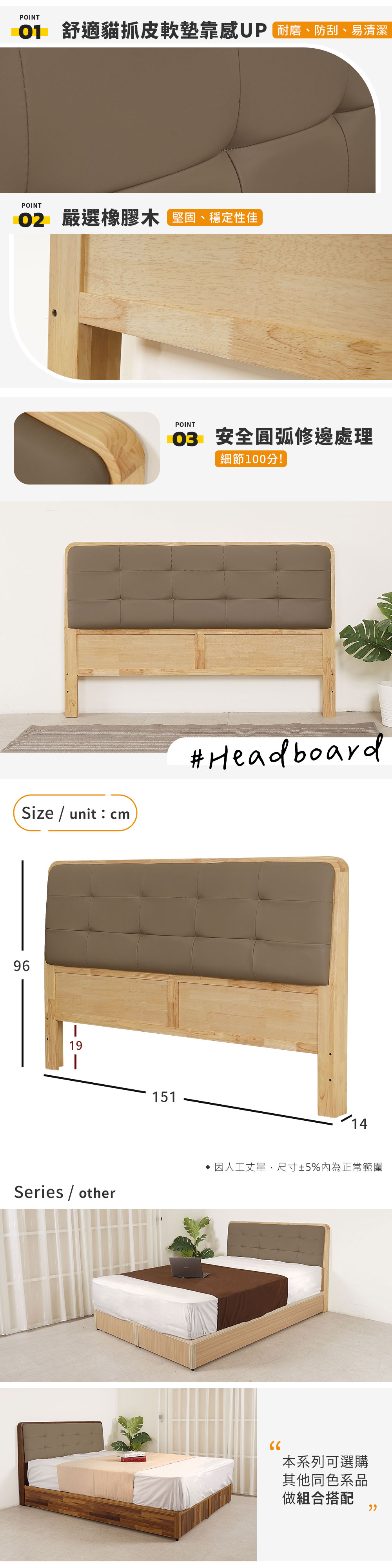 ◆嚴選穩固耐用的橡膠木◆耐磨、防刮貓抓皮靠墊◆日式風格,清新簡約感◆免組裝由專人配送到府整組配件:5尺床頭片尺寸:寬 151 x 厚 14 x 高 96 公分材質:貓抓皮、橡膠木顏色:原木色產地:中國誤差值:因人工丈量,尺寸±5%內為正常範圍