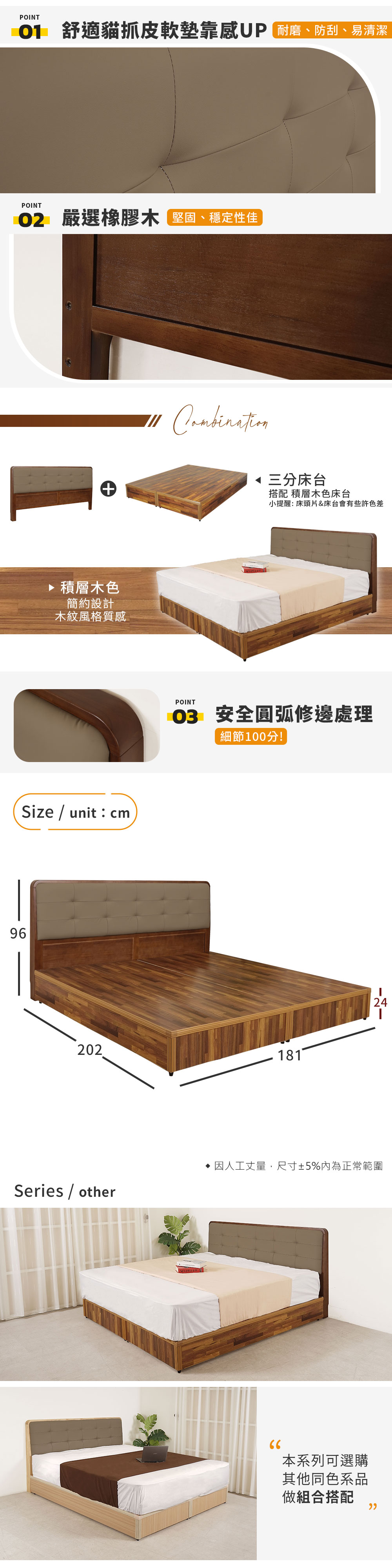 整組配件:6尺床頭片x1+6尺床台x1(不含床墊)適用床墊:6 x 6.2 尺尺寸:寬 181 x 深 202 x 高 96 公分材質:貓抓皮、橡膠木、三分夾板顏色:胡桃色產地:中國誤差值:因人工丈量,尺寸±5%內為正常範圍