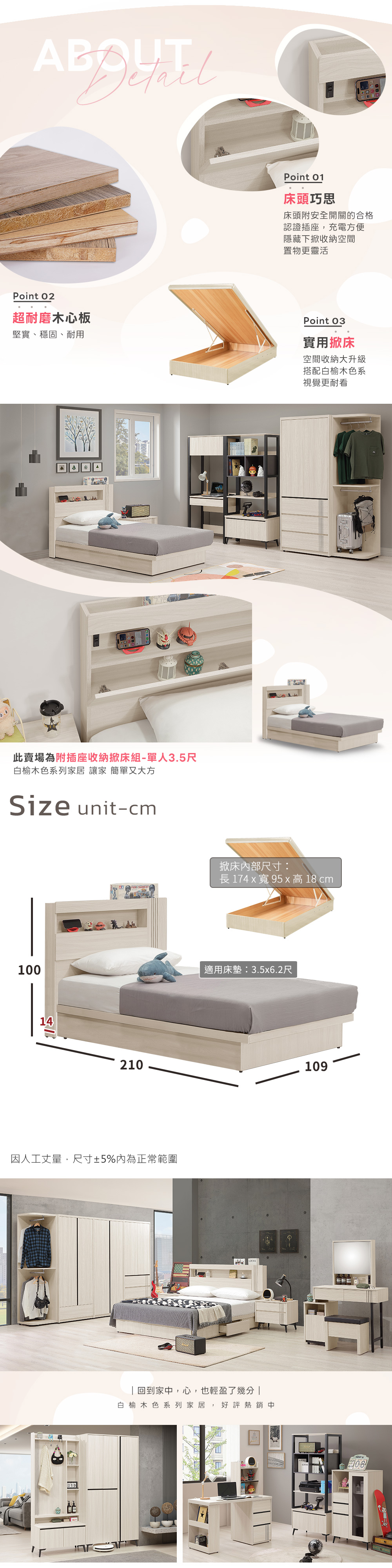 ◆白榆現代、英倫風格◆床頭附有插座,方便充電◆床頭隱藏下掀收納小物◆床頭片+掀床組合◆免自行組裝,專人配送到府整組商品:3.5尺床頭片 x 1 + 3.5掀床 x 1尺寸:寬 109 x 深 210 x 高 100 公分適用床組規格:3.5 x 6.2 尺材質:高級木心板顏色:白榆木色產地:台灣誤差值: 因人工丈量,尺寸±5%內為正常範圍