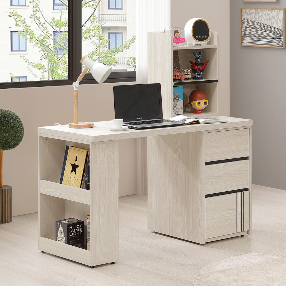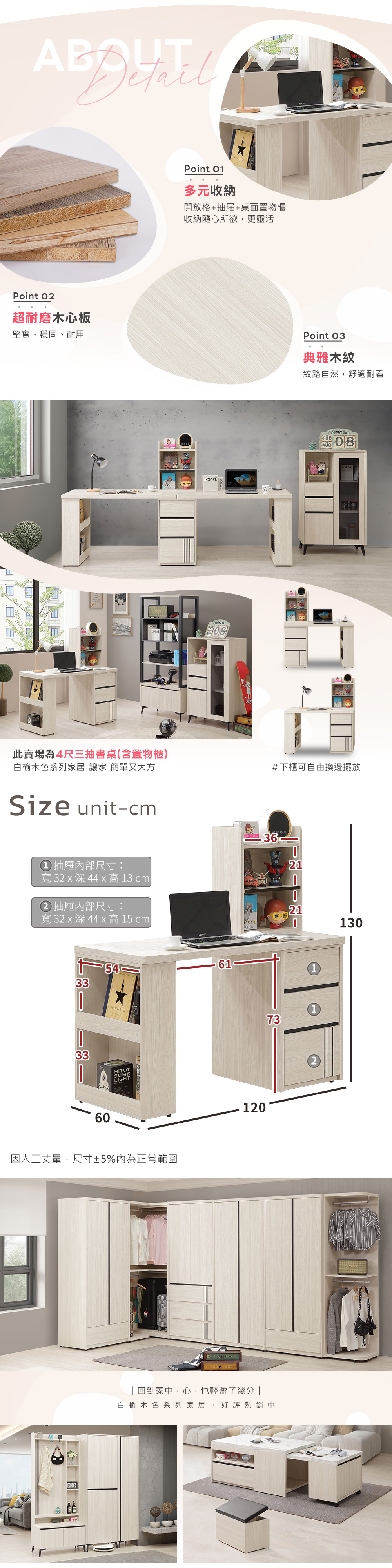 ◆白榆現代、英倫風格◆桌面置物櫃方便收納物品◆下方三抽收納空間◆開放格可依需求更換方向◆免自行組裝,專人配送到府尺寸:寬 120 x 深 60 x 高 130 公分材質:高級木心板+仿石美耐皿板顏色:白榆木色產地:台灣誤差值: 因人工丈量,尺寸±5%內為正常範圍