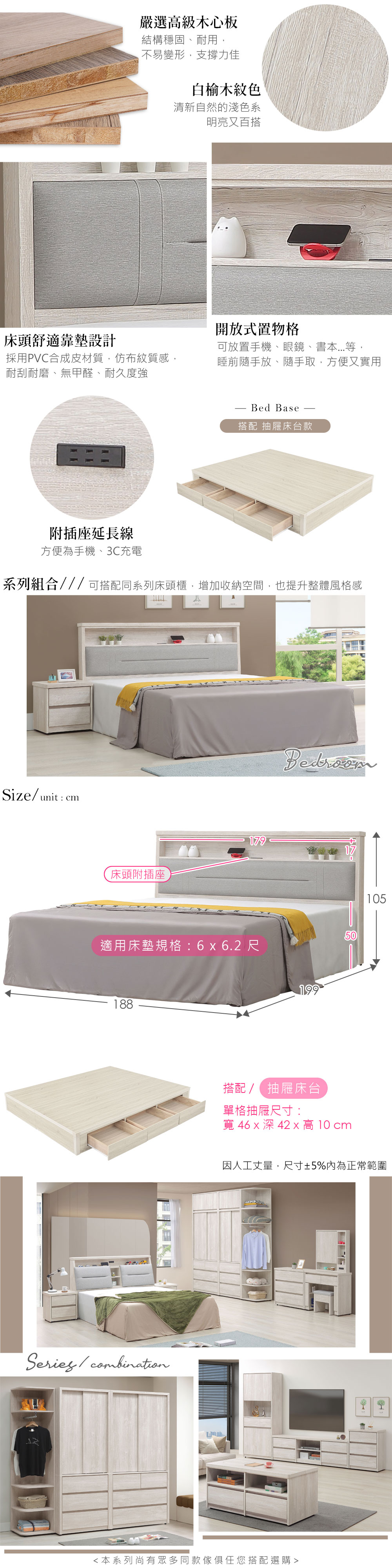 ◆木心板材質,堅實、穩固、耐用◆清新淺色系,質感木紋路視覺◆仿布紋質感的舒適 PVC皮靠墊◆床頭有置物格,增加收納空間◆附安全插座,手機、3C充電好方便◆搭配抽屜床台,共六抽屜,分類收納好整齊!◆免組裝,專人配送到府整組商品:床頭片 x 1 + 抽屜床台 x 1 (不含床墊)尺寸:寬 188 x 深 199 x 高 105 公分適用床墊規格:6 x 6.2 尺材質:高級木心板、PVC皮、三分夾板顏色:白榆木色產地:台灣誤差值:因人工丈量,尺寸±5%內為正常範圍