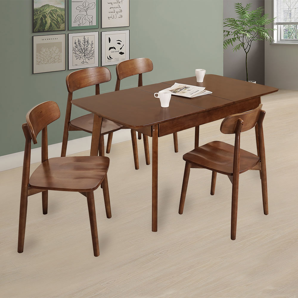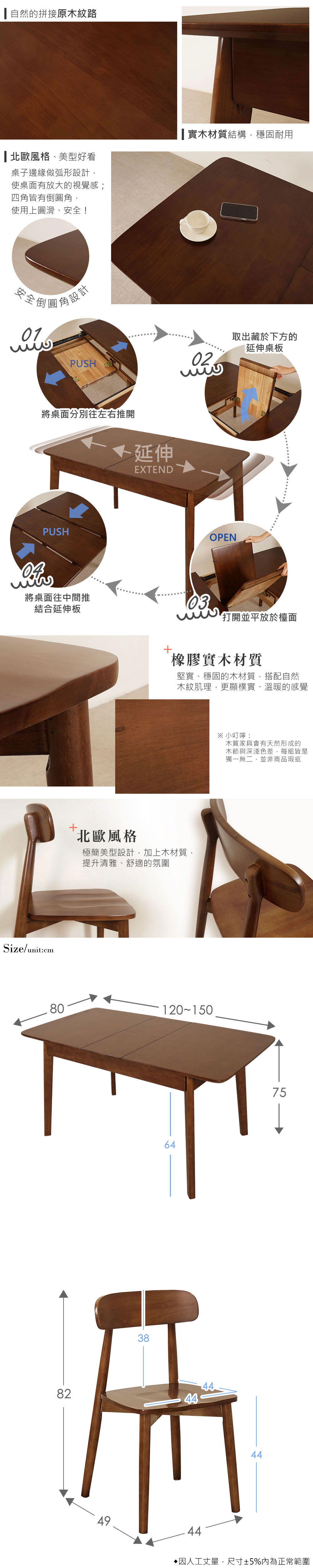 ◆可伸縮延長,機能性佳◆實木材質結構,穩固耐用◆北歐風格餐桌,美型好搭◆弧形椅背設計,靠坐好舒適◆免自行組裝,專人配送到府整體配件:餐桌 x 1 + 餐椅 x 4桌子尺寸:寬 120~150 x 深 80 x 高 75 公分椅子尺寸:寬 44 x 深 49 x 高 82 公分材質:橡膠木顏色:胡桃色產地:中國誤差值:因人工丈量,尺寸±5%內為正常範圍