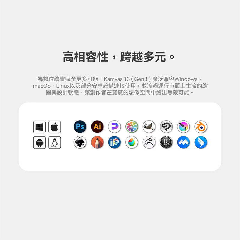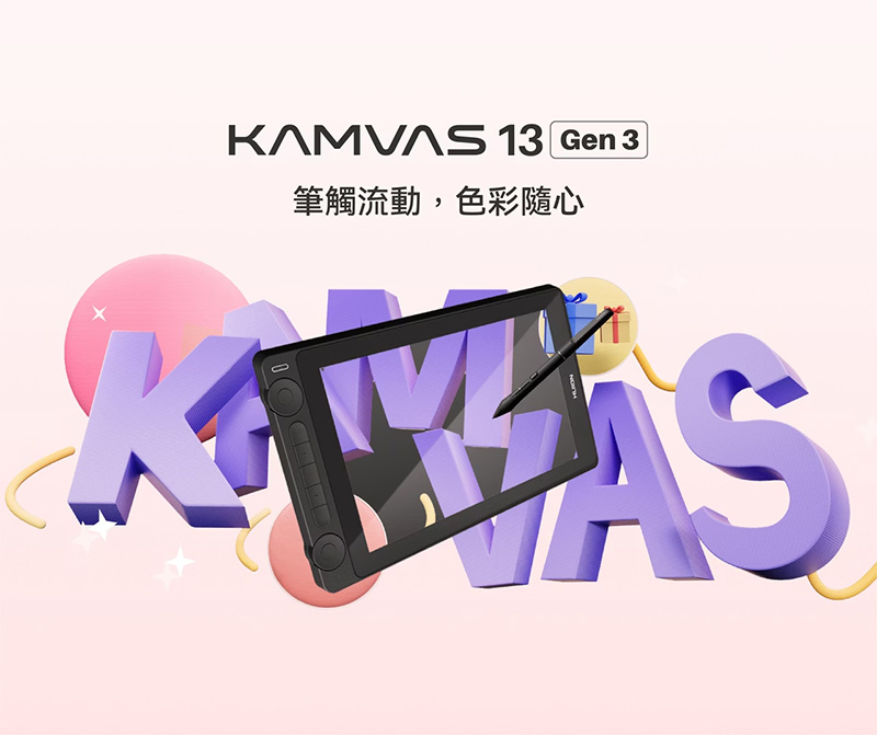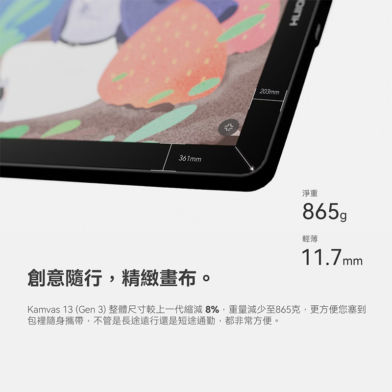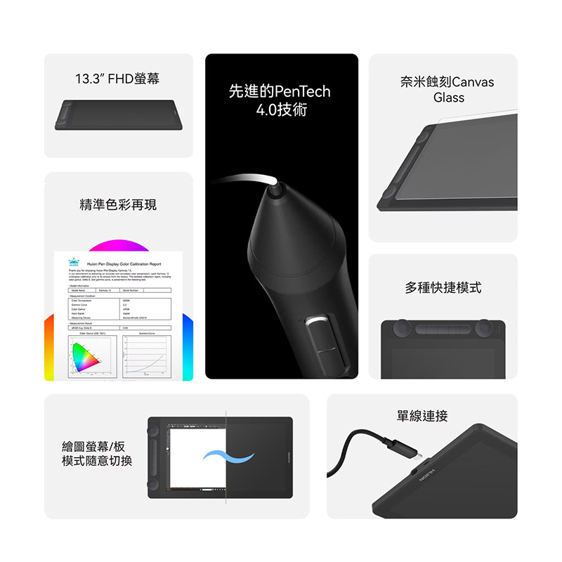 服務支持(驅動&說明書/常見問題/售後服務/固件下載):https://www.huion.com/tw/support*Android手機、平板或相關設備,有支援Type-C視訊輸出者均可使用,購買前請向供應商查詢是否支援。*若您的電腦無HDMI視頻接口,需請自備視頻轉換器。1. 購買HUION本產品可提供一年內保修。2. 產品問題經檢測後,若非人為因素,客戶可在第一個月內一對一換新。包裝內容Kamvas 13(Gen3)繪圖螢幕PW600L數位筆ST300支架三合一連接線USB延長線筆芯PN06x10 ※筆盒可旋轉開,筆芯收納在筆盒裡筆座PH06清潔布繪圖手套快速指南商品規格產品名稱:Kamvas 13(Gen3)產品型號:GS1333顏色:宇宙黑外形尺寸:361.21 x 202.77 x 11.7mm淨重:865g功能鍵:5個自定義按鍵+雙旋鈕控制器+2個功能切換按鈕視訊訊號接口:三合一USB-C、全功能USB-C分辨率:1920 x 1080(16:9)液晶模式:IPS 防眩光玻璃:第二代低閃點防眩光蝕刻玻璃全貼合:YES可視角度:85°/85°(H)/85°/85°(V) (Typ.)(CR>10)對比度:1000:1亮度:220cd/m2色域:120% sRGB顯示顏色:16.7M(8bit)響應時間:25ms(典型值)壓力感應:16384Levels手寫分辨率:5080LPI筆感應技術:無電池電磁共振精確度:±0.3mm(Center) ±2mm(Corner)感應高度:10mm讀取速率:>266PPS傾角識:±60°電源輸入:AC 100-240V,50/60Hz電源輸出:5V 2A工作功耗:≤7W待機功能:-工作濕度與溫度:0-40°C、20-80%存儲溫度及濕度:-20°C~60°C、10-90%作業系統:Windows 7 、macOS 10.12 或以上、Android(USB3.1 DP1.2)、Linux(Ubuntu 20.04 LTS)BSMI許可字號:R34235以上資料內容如有任何錯誤,以原廠所公布資料為準!*提醒您,猶豫期非試用期,主商品、贈品一經拆封使用,將影響您退換貨權利,若您不滿意此商品,請勿拆封、使用。辦理退換貨時,商品必須是全新狀態與完整包裝(請注意保持商品本體、配件、贈品、保證書、原廠包裝及所有附隨文件或資料的完整性,切勿缺漏任何配件或損毀原廠外盒)。退回商品無法回復原狀者,恐將影響退貨權益或需負擔部分整新費用。
