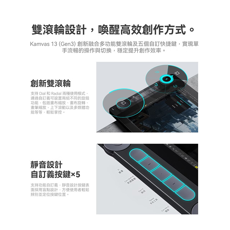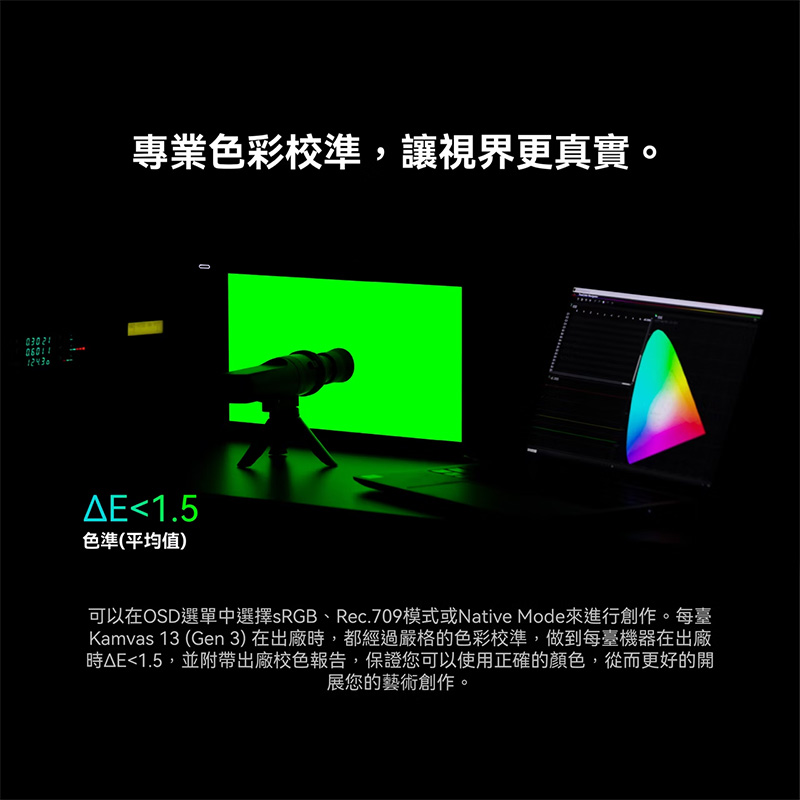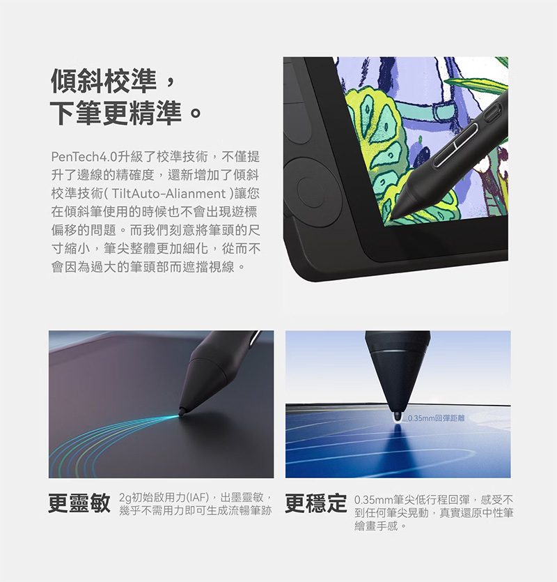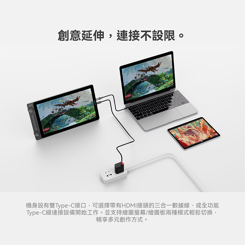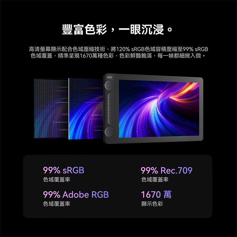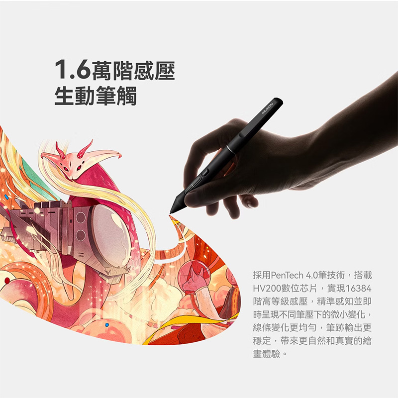 商品介紹芯中所繪,盡顯出彩● 120%sRGB色域,色彩豐富多彩 ● 專業色彩校準,Delta E<1.5高色準<br>● 螢幕全貼合技術,第二代低閃點防眩光玻璃 ● 多功能雙滾輪+5個自訂按鍵,提升創作效率 ● 新升級 PenTech4.0技術應用●16384級 / >266PPS / 5080LPI ● 兼容Windows/macOS/Android(USB3.1 GEN1.2) /Linux(Ubuntu 20.04 LTS)