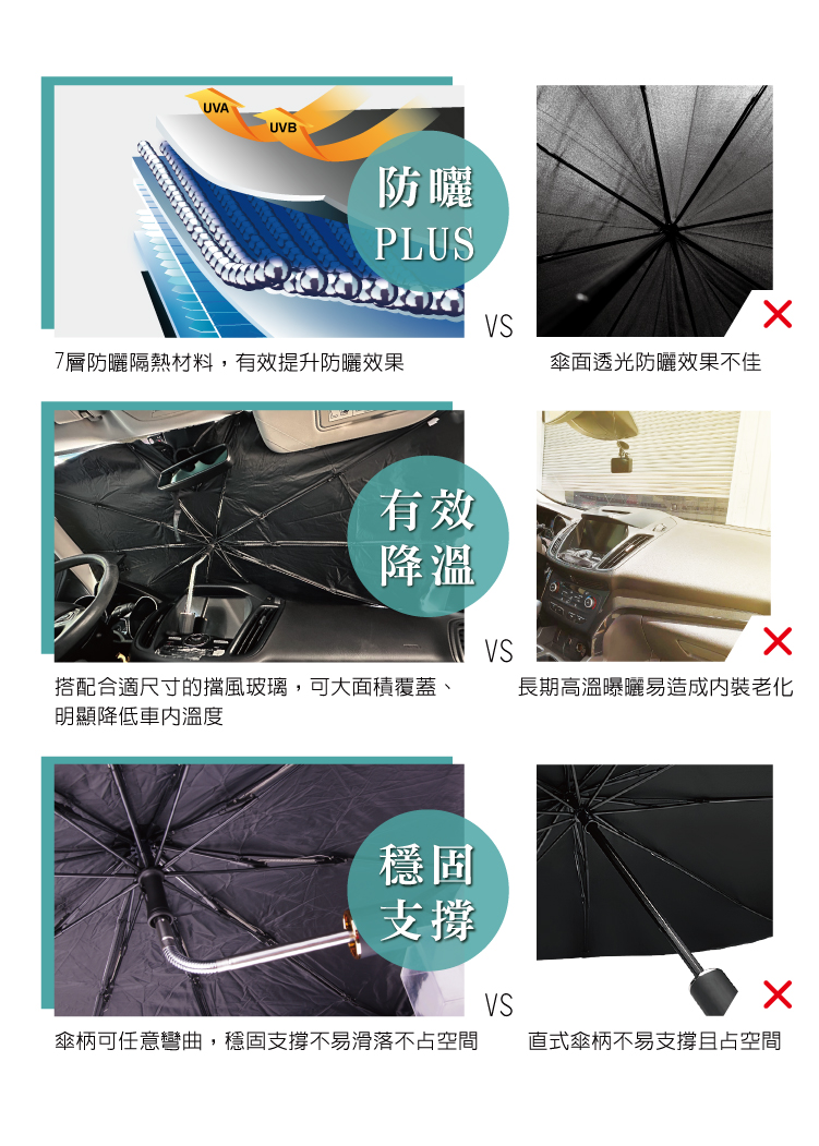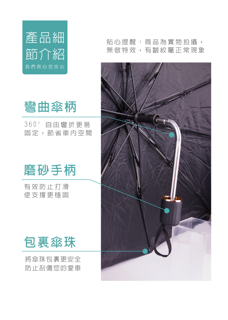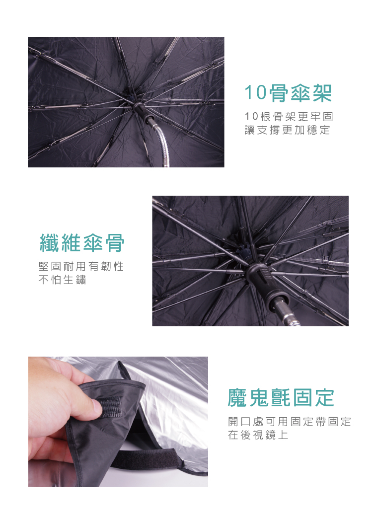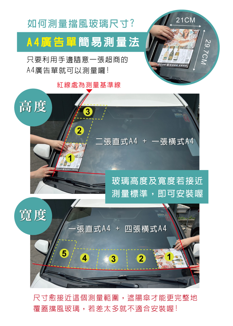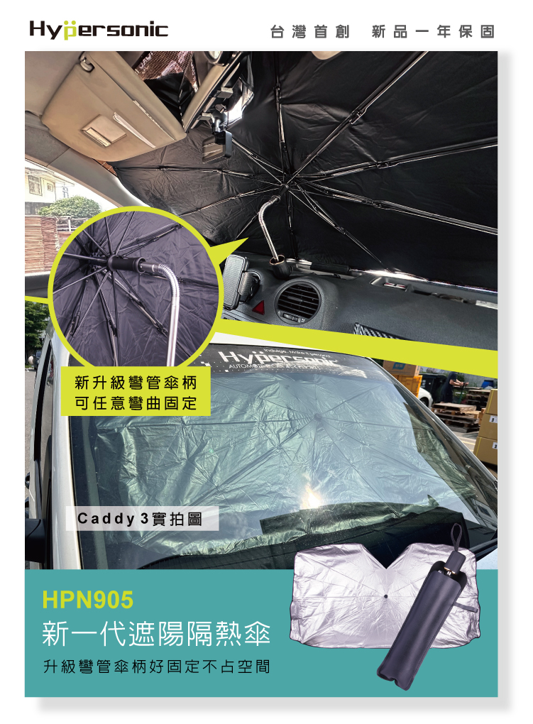 商品介紹‧ 新升級彎管傘柄,任意彎折好固定、節省空間。‧ 七層防曬隔熱材料,防曬更專業。‧ 鈦銀材質有效阻隔強光熱能、降低車內溫度。‧ 附贈質感皮套,好收納不占空間。‧ 適合中大型SUV、MPV/商旅車/小貨卡。‧ 使用簡易A4廣告單測量法,讓您輕鬆測量愛車尺寸。規格說明‧ 品名:Hypersonic 汽車隔熱遮陽傘(中大)‧ 尺寸:76x138cm‧ 數量:一組1入‧ 顏色:黑色‧ 產地:台灣注意事項‧ 安裝/拆卸時請注意不影響行車安全。‧ 選購前請先測量愛車尺寸再下單。