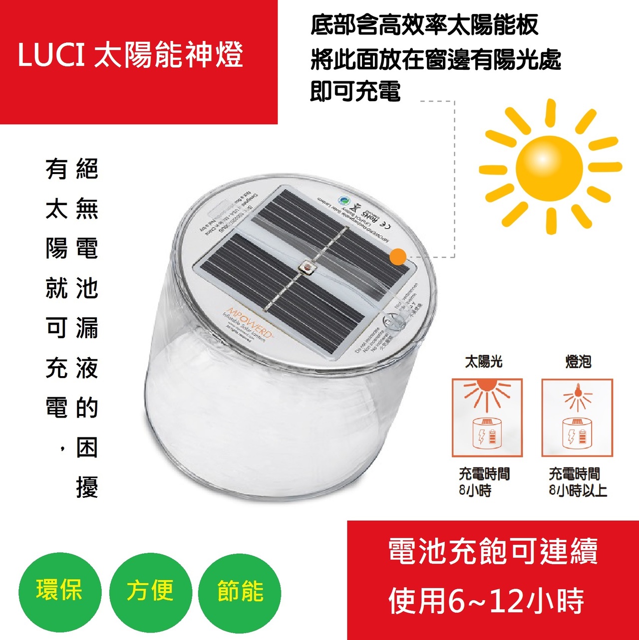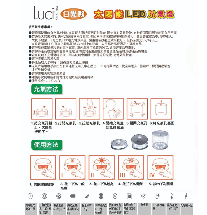 設計:重量113公克設定防水可達1公尺太陽能板,電池和LED燈一體成型三段式亮燈:一般燈,超亮燈,閃爍燈可折疊和擴張:13公分直徑,2.6公分收縮高度,11.5公分展開高度防水防塵等級IP67照射範圍14平方公尺10顆超亮LED燈充電:鋰電池壽命300~500次(日常使用2年以上)防過度充電保護裝置防過電流,防短路保護裝置使用一般燈可持續12小時亮燈(需在太陽光下充滿8小時)可在太陽光和燈泡下充電(陽光直射為佳)尺寸:充氣展開-13.5CM(直徑)*12.5CM(高)壓縮收納-13.5CM* 2CM 包裝(1個)13.5* 2CM重量:200克包裝(單組含包裝)充電時間:8小時可充滿蓄電池,點亮時間:6〜12小時