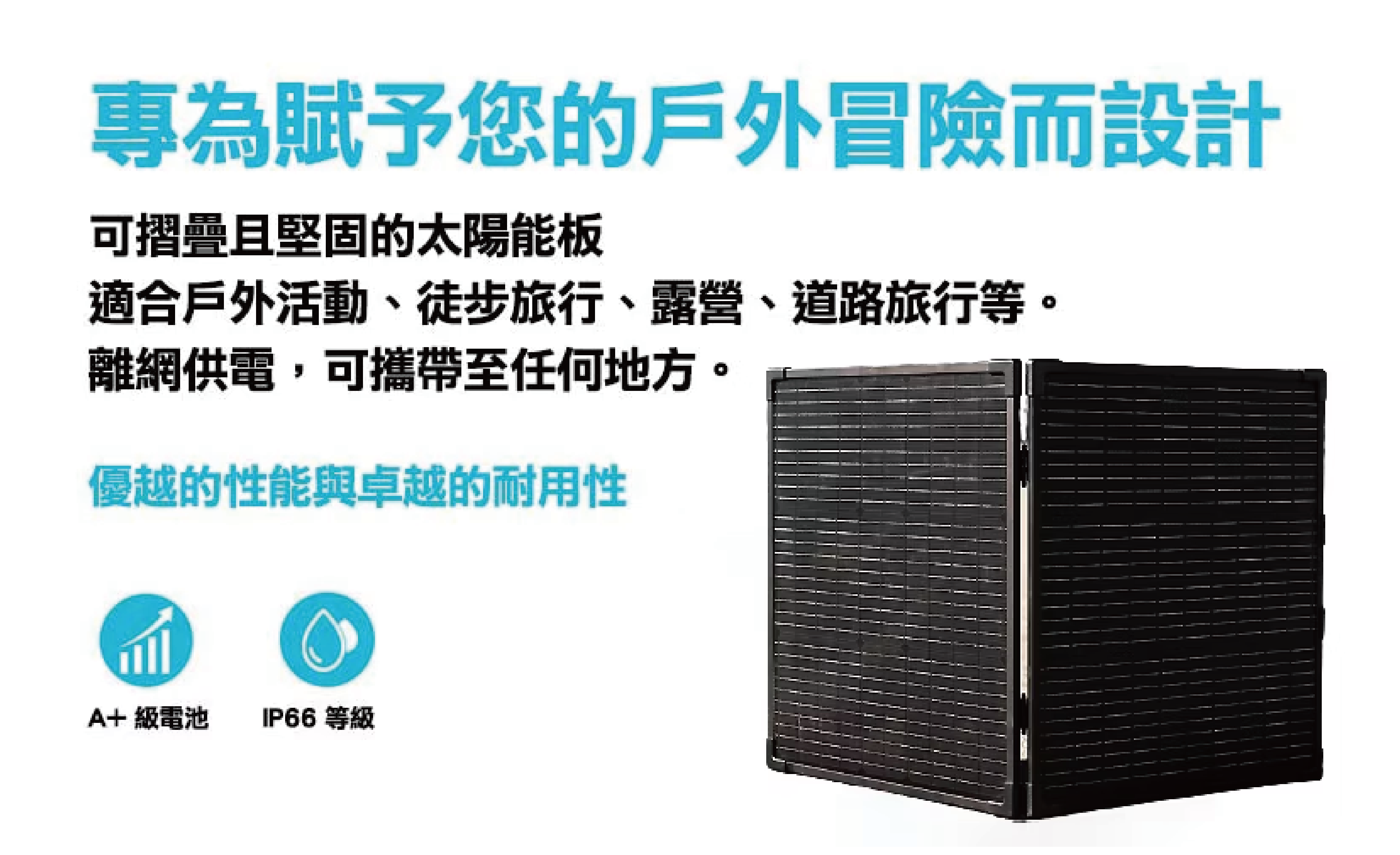 輕巧便攜:這款太陽能板非玻璃材質,重量只有3.8KG, 設計輕盈,可輕鬆摺疊成小巧的尺寸,方便攜帶到任何地方。無論是露營、郊遊、徒步旅行還是野外探險