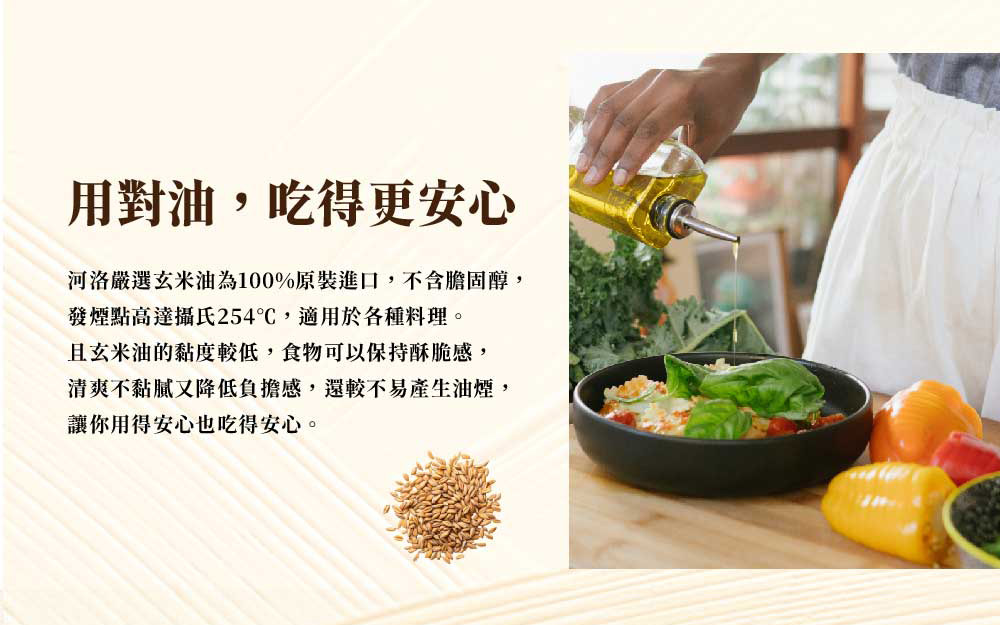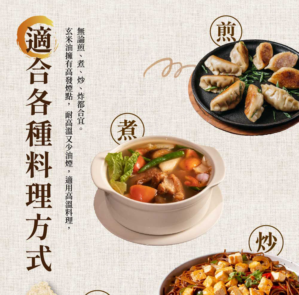 玄米油擁有高發煙點,適合多種烹飪方式,無論是煎、炒、炸等等,