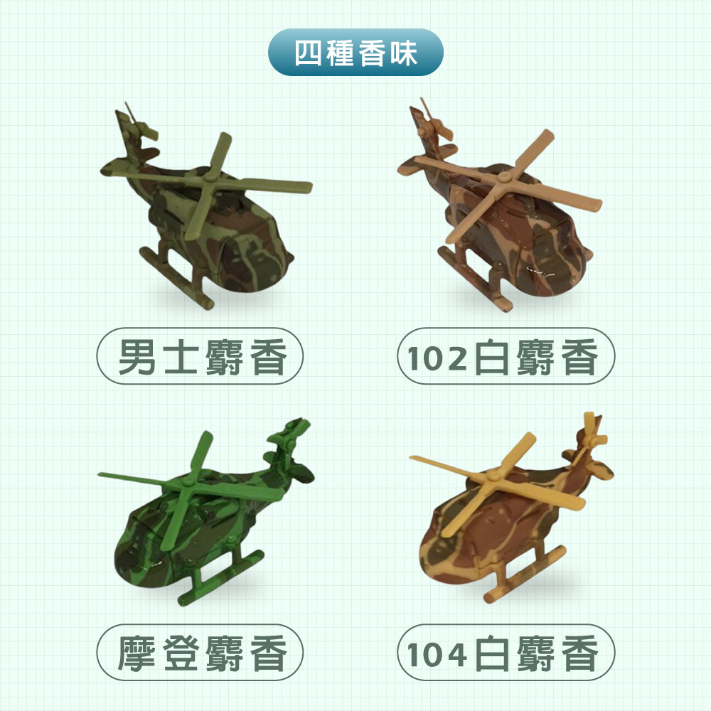 【商品介紹】• 直升機造型設計,利用冷氣風帶動螺旋槳旋轉增添趣味。• 安裝在車內冷氣出風口葉片上,迷你小巧,時尚美觀,不佔位置、不擋出風口。【規格說明】品名日本 JCT直升機造型冷氣孔芳香劑香味:男士麝香 / 02白麝香 / 摩登麝香 / 104白麝香重量 :1.2g產地:台灣【注意事項】• 萬一不慎吞食,勿催吐,帶此產品立即就醫。• 使用時若有不適感,立即停用,使車內通風即可。