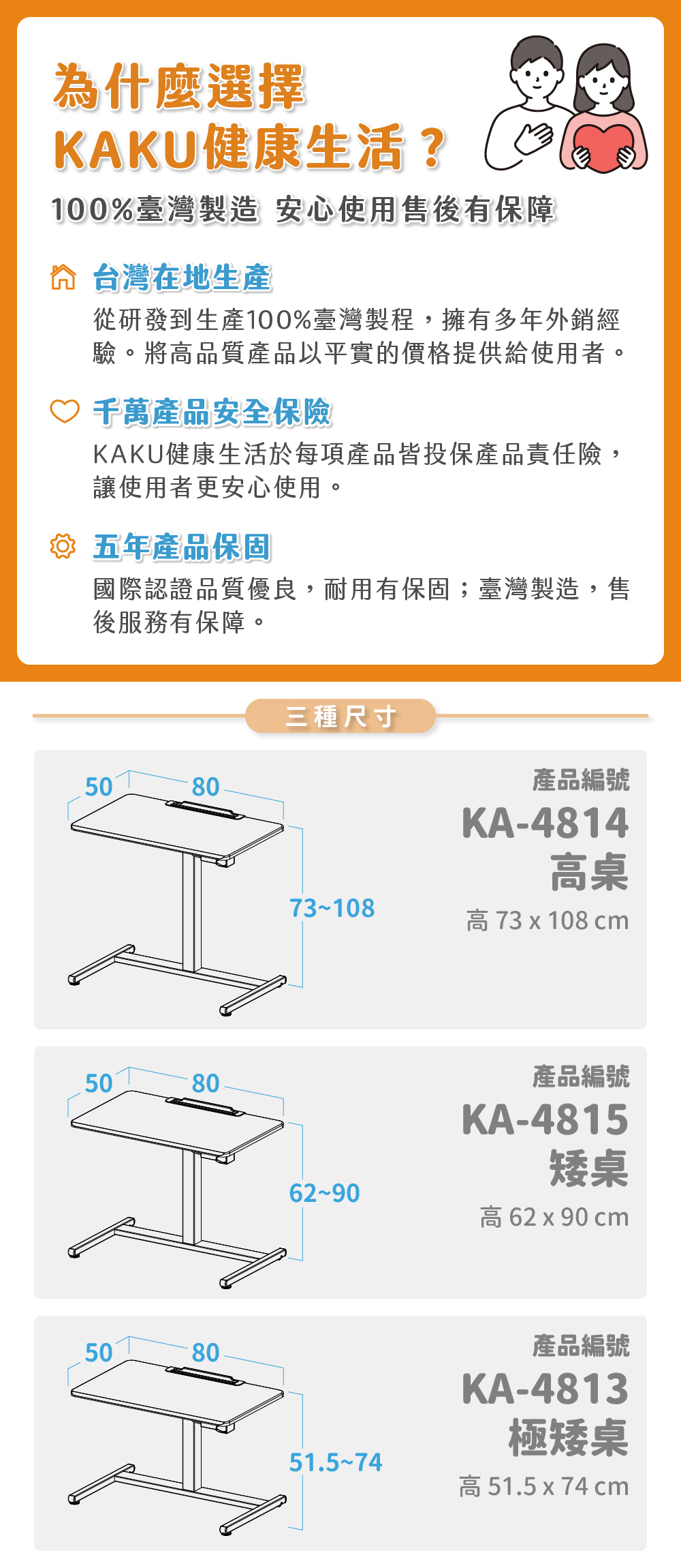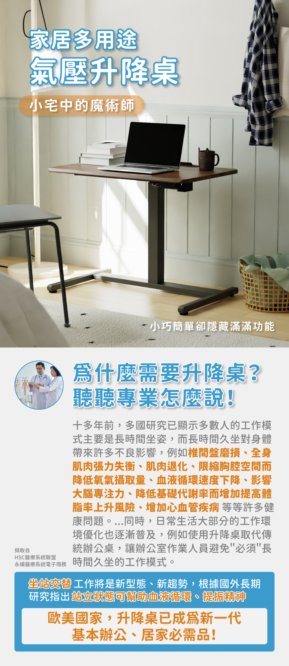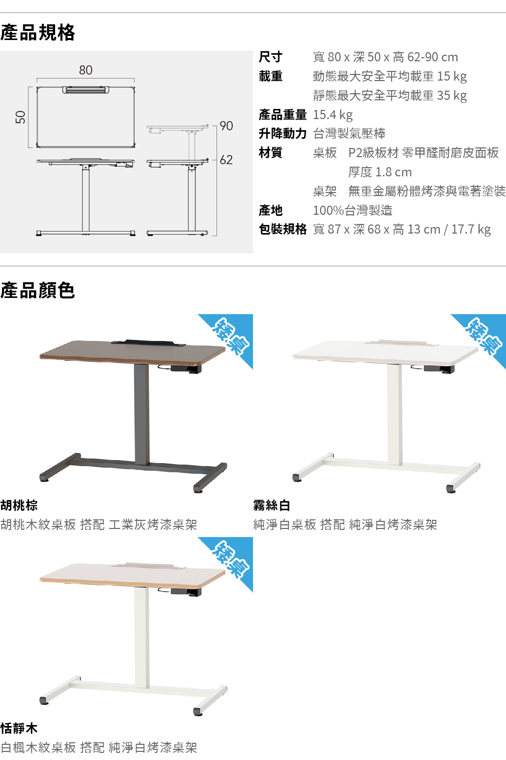 尺寸 寬 80 x 深 50 x 高 62-90 cm載重 動態最大安全平均載重 15 kg 靜態最大安全平均載重 35 kg產品重量 15.4 kg升降動力 臺灣製氣壓棒材質 桌板 P2級板材 零甲醛耐磨皮面板 厚度 1.8 cm 桌架 無重金屬粉體烤漆與電著塗裝產地 100%臺灣製造包裝規格 寬 87 x 深 68 x 高 13 cm / 17.7 kg