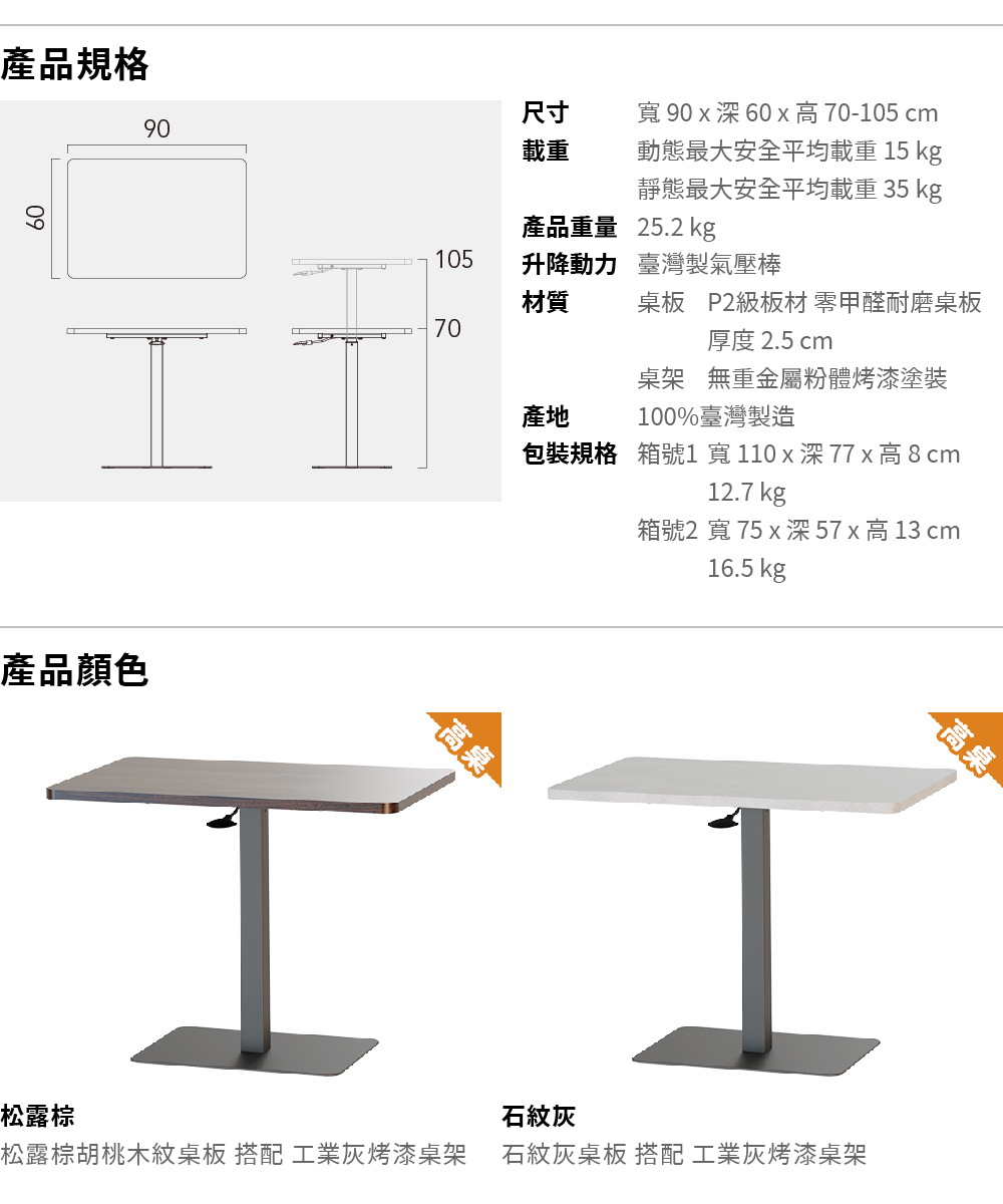 尺寸 寬 90 x 深 60 x 高 70-105 cm載重 動態最大安全平均載重 15 kg 靜態最大安全平均載重 35 kg產品重量 25.2 kg升降動力 臺灣製氣壓棒材質 桌板 P2級板材 零甲醛耐磨美耐皿板 厚度 2.5 cm 桌架 無重金屬粉體烤漆塗裝產地 100%臺灣製造包裝規格 箱號1 寬 110 x 深 77 x 高 8 cm / 12.7 kg 箱號2 寬 75 x 深 57 x 高 13 cm / 16.5 kg