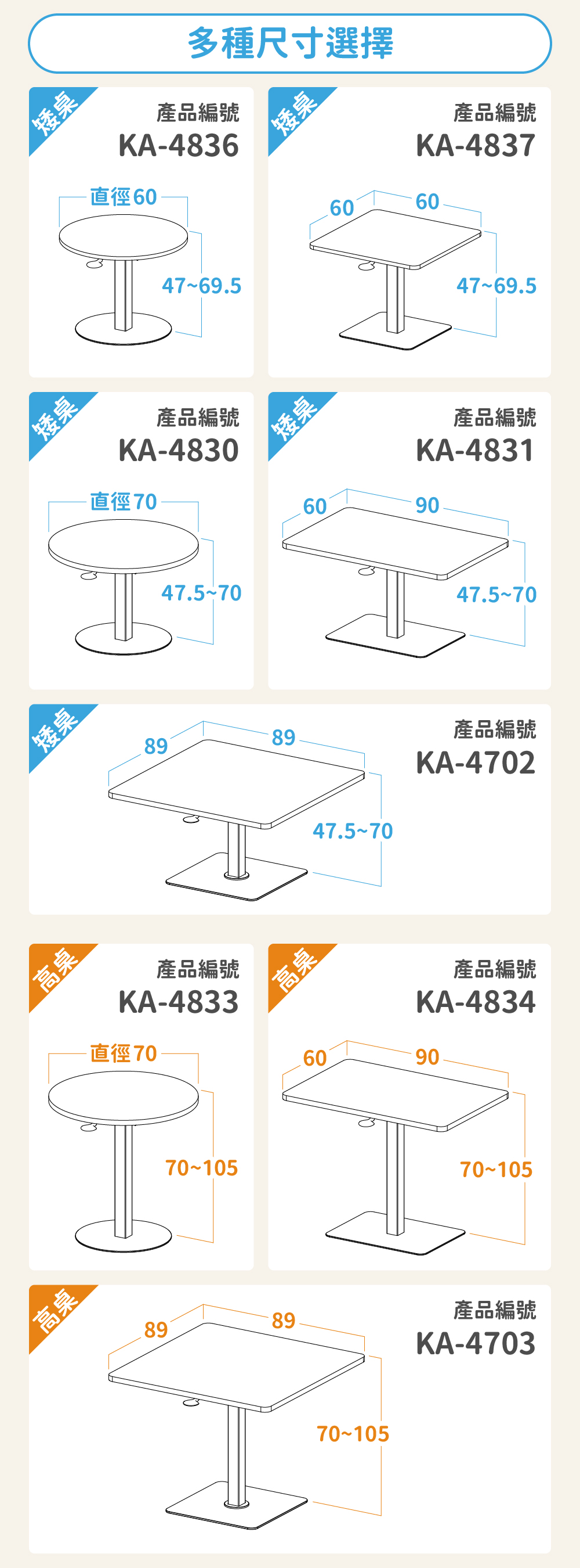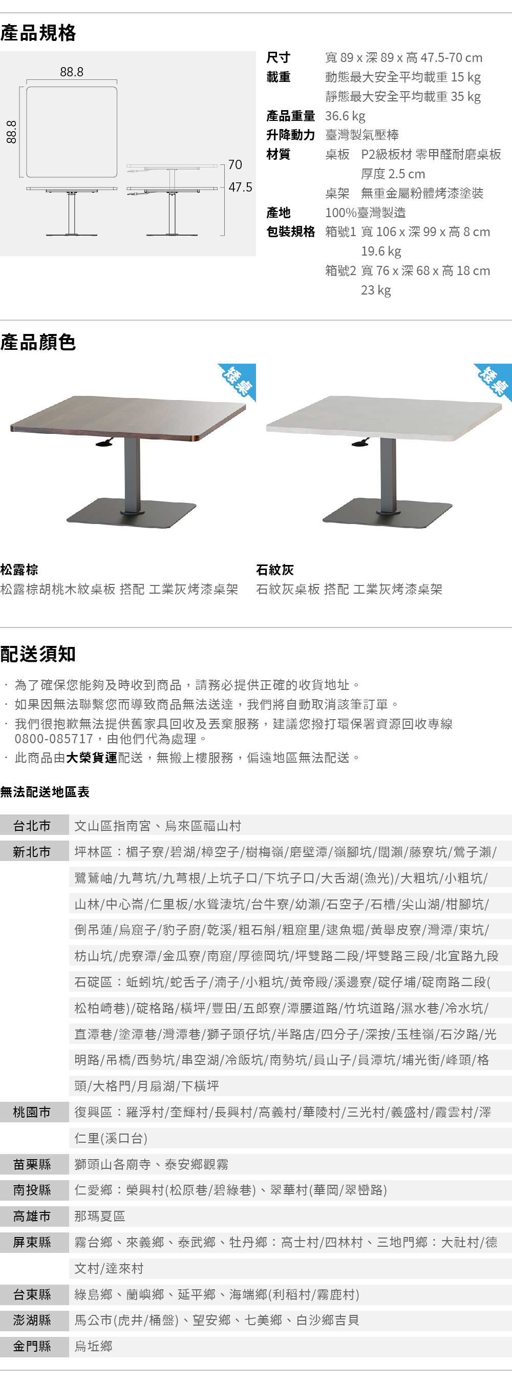 尺寸 寬 89 x 深 89 x 高 47.5-70 cm載重 動態最大安全平均載重 15 kg 靜態最大安全平均載重 35 kg產品重量 36.6 kg升降動力 臺灣製氣壓棒材質 桌板 P2級板材 零甲醛耐磨美耐皿板 厚度 2.5 cm 桌架 無重金屬粉體烤漆塗裝產地 100%臺灣製造包裝規格 箱號1 寬 106 x 深 99 x 高 8 cm / 19.6 kg 箱號2 寬 76 x 深 68 x 高 18 cm / 23 kg