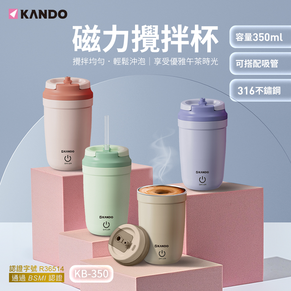 產品特點 ● 採用升級款磁力攪拌棒,磁吸更強,尺寸更長,攪拌更均勻。輕鬆拆卸不卡汙垢。● IPX6級防水,無縫一體化杯身,清洗時可隔絕水進入,放心水洗。● 高轉速電機帶動磁力棒,產生強勁的旋渦水流,能夠加速水和粉末混合,讓飲品口感更加滑順。● 雙擊啟動自動攪拌,解放您的雙手,只需一指啟動,即刻高速攪拌飲品。● 單擊電源開關即可停止攪拌。● 能夠自動攪拌咖啡、沖泡粉、葡萄糖粉、蛋白粉、牛奶或蜂蜜等。省時省力,輕鬆擁有美好口感。● USB-C高效充電,電池續航久,充電一次可連續使用60分鐘。● 內膽選用優質316不鏽鋼精心打造,具有更卓越的抗腐蝕性,滿足對食安與品質的極致追求。● 巧妙的杯蓋設計,可開蓋飲用或搭配吸管使用。產品規格 品牌:KANDO品名:磁力攪拌杯型號:KB-350顏色:米色/紫色/粉色/綠色BSMI認證字號:R36514產品容量:350ml 內膽材質:316不鏽鋼 充電接口:USB-C 額定電壓:5V⎓電池容量:250mAh 產品功率:2W產品尺寸:約15.5×9×8cm包裝尺寸:約15.7×9.2×9 cm產品淨重:約260.5g產品毛重:約319.3g包裝內容:磁力攪拌杯×1、升級款磁力攪拌棒×1、USB-A轉USB-C充電線×1、使用說明書×1保固:90天(非人為因素) 備註:此賣場不含主機相關展示商品 注意:鑑賞期非試用期,所退回之商品必須包裝完整且全新狀態,請保持商品本體 / 配件 / 原廠包裝及隨附文件完整。如有拆封、使用痕跡,恕無法辦理退貨商品。