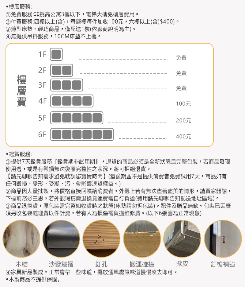 1.3樓以下+電梯免樓層費,4樓以上單購以上加收100元(含)、掀床.衣櫃及雙層床每層樓加收200元,樓層疊加。(部分衣櫃以及沙發由專員告知)