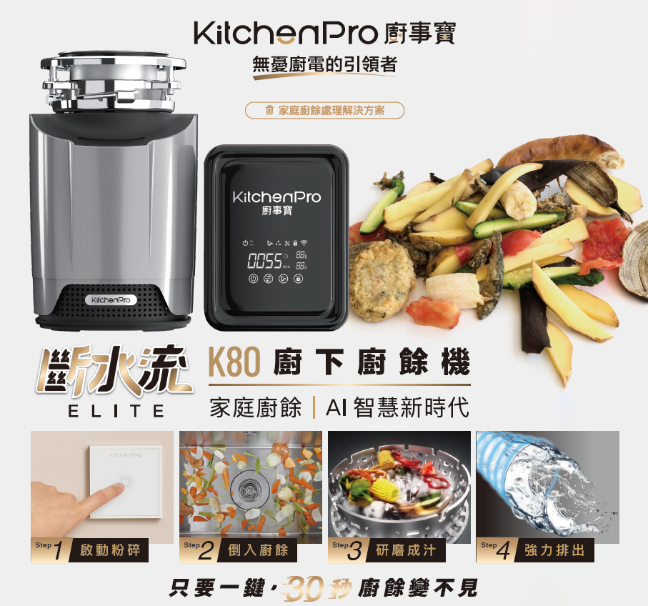 【麗水生活】廚事寶 KitchenPro 斷水流 K80 Elite 櫥下式 AI處理 廚餘處理機 廚餘大師 AI廚餘機