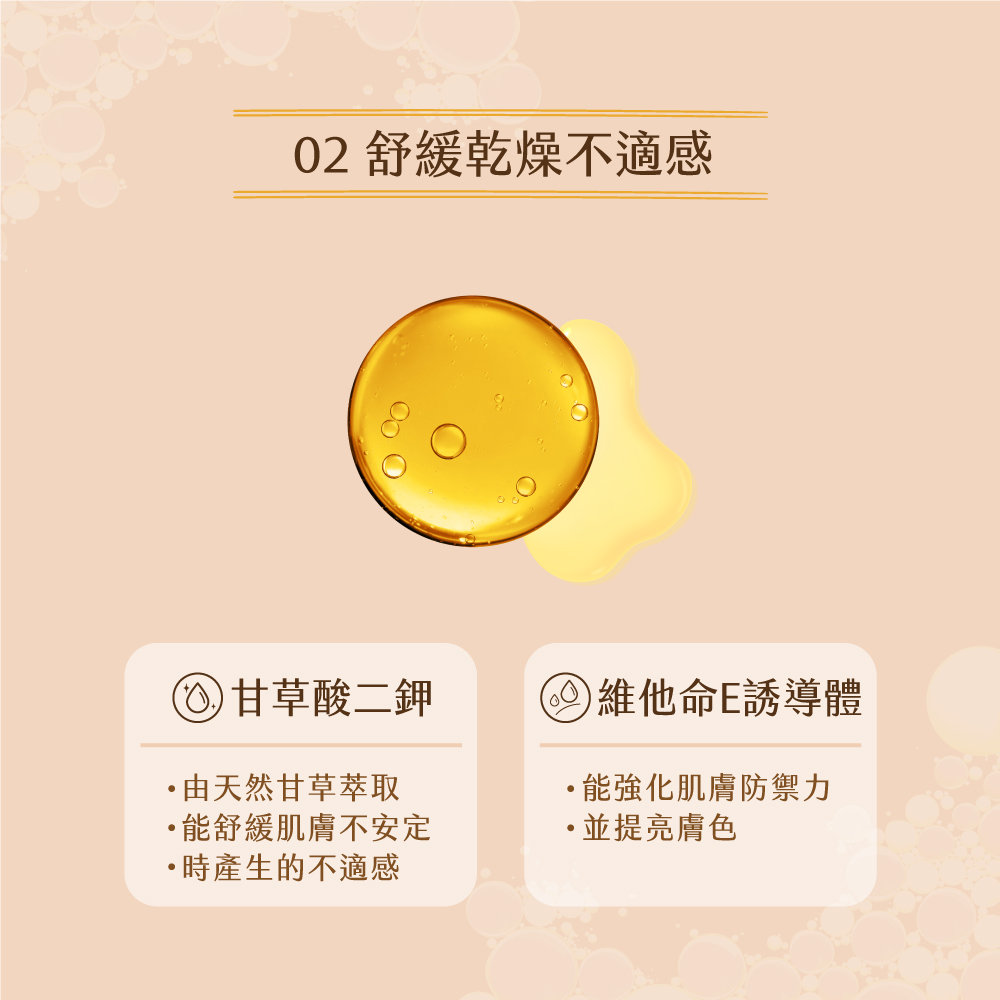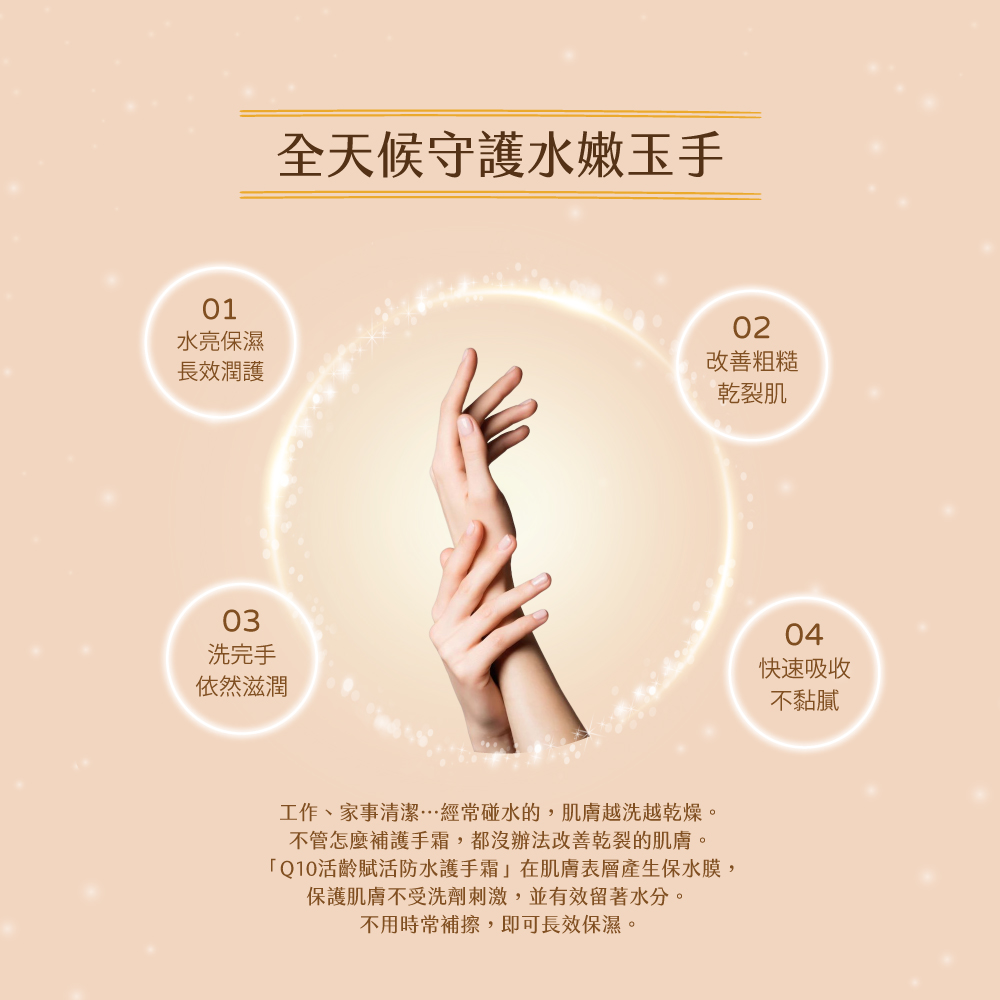 高濃度Q10與多種潤護精華改善乾紋恢復柔滑嫩手。