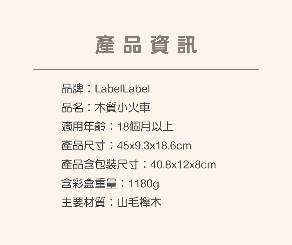 尺寸:40.8x12x8cm重量:900g材質:山毛櫸木產地:中國●噗噗!ㄑㄧㄥ ㄑㄧㄤ!ㄑㄧㄥ ㄑㄧㄤ!小寶貝乘著火車出發去冒險!●不同形狀的積木堆疊在火車上,也能自由搭建一個山洞●火車上乘載不同形狀的積木往山洞前進●採用FSC™認證木質製成,外觀顏色使用兒童友善的水性顏料●學習主題:眼部協調/手部小肌肉/堆疊/形狀/顏色