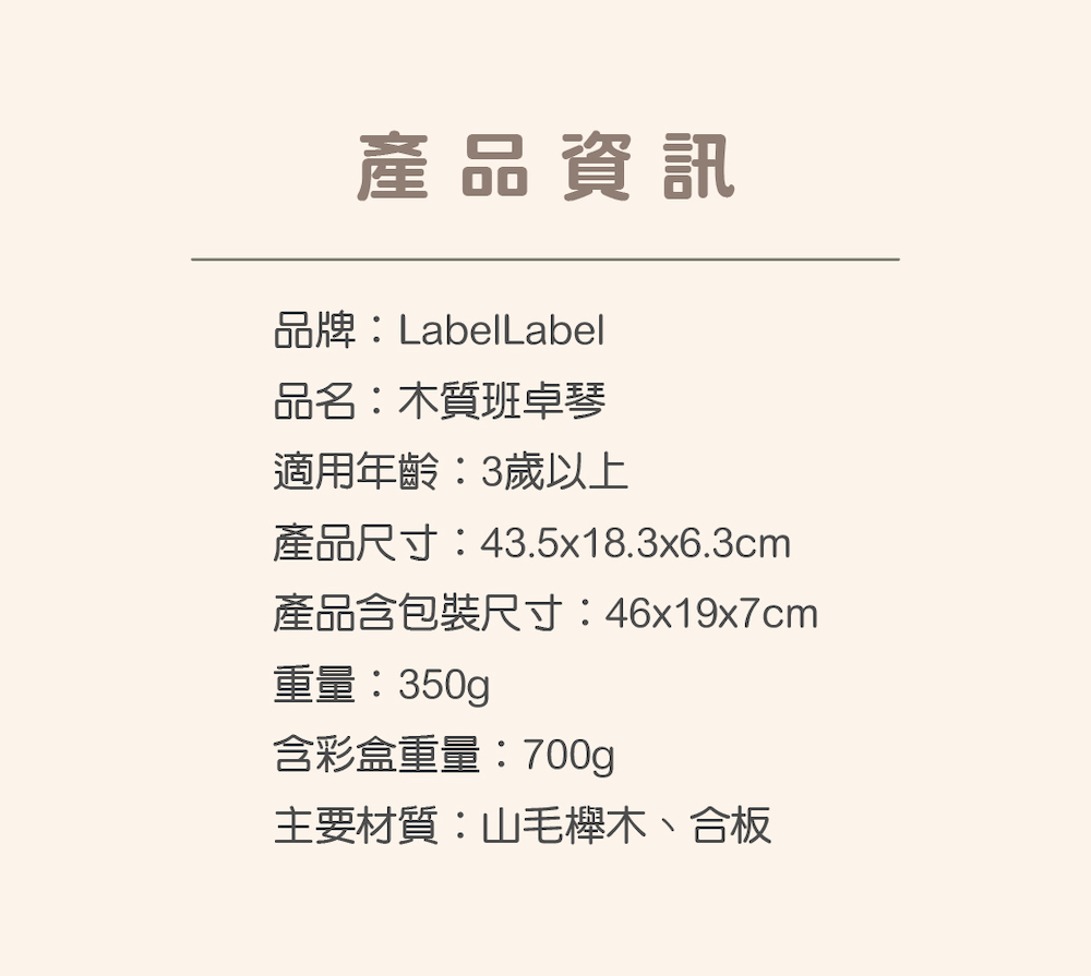 尺寸:43.5x18.3x6.3cm重量:350g材質:山毛櫸木、合板產地:中國●簡單的樂器,小小音樂家演奏出美妙動人的旋律●以撥奏方式發聲,音色清脆響亮●愛心的調音扭,增加趣味●學習主題:眼部協調/手部小肌肉/音樂