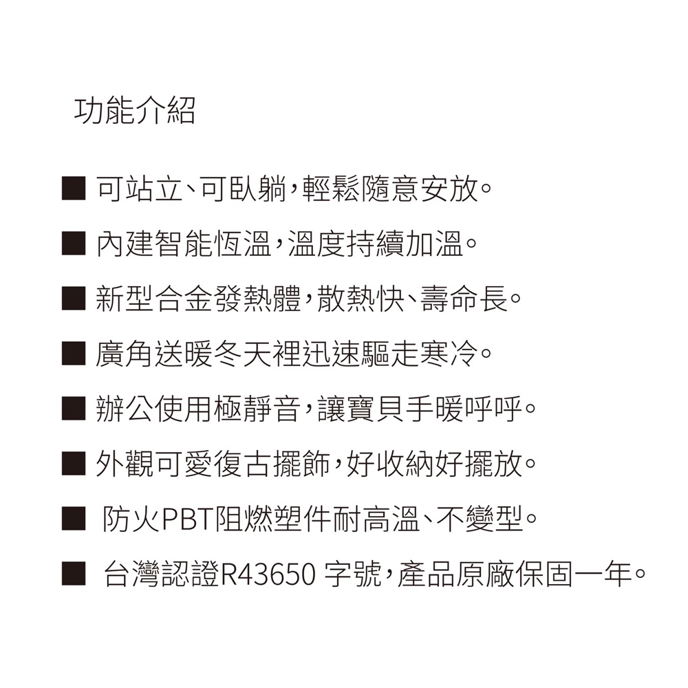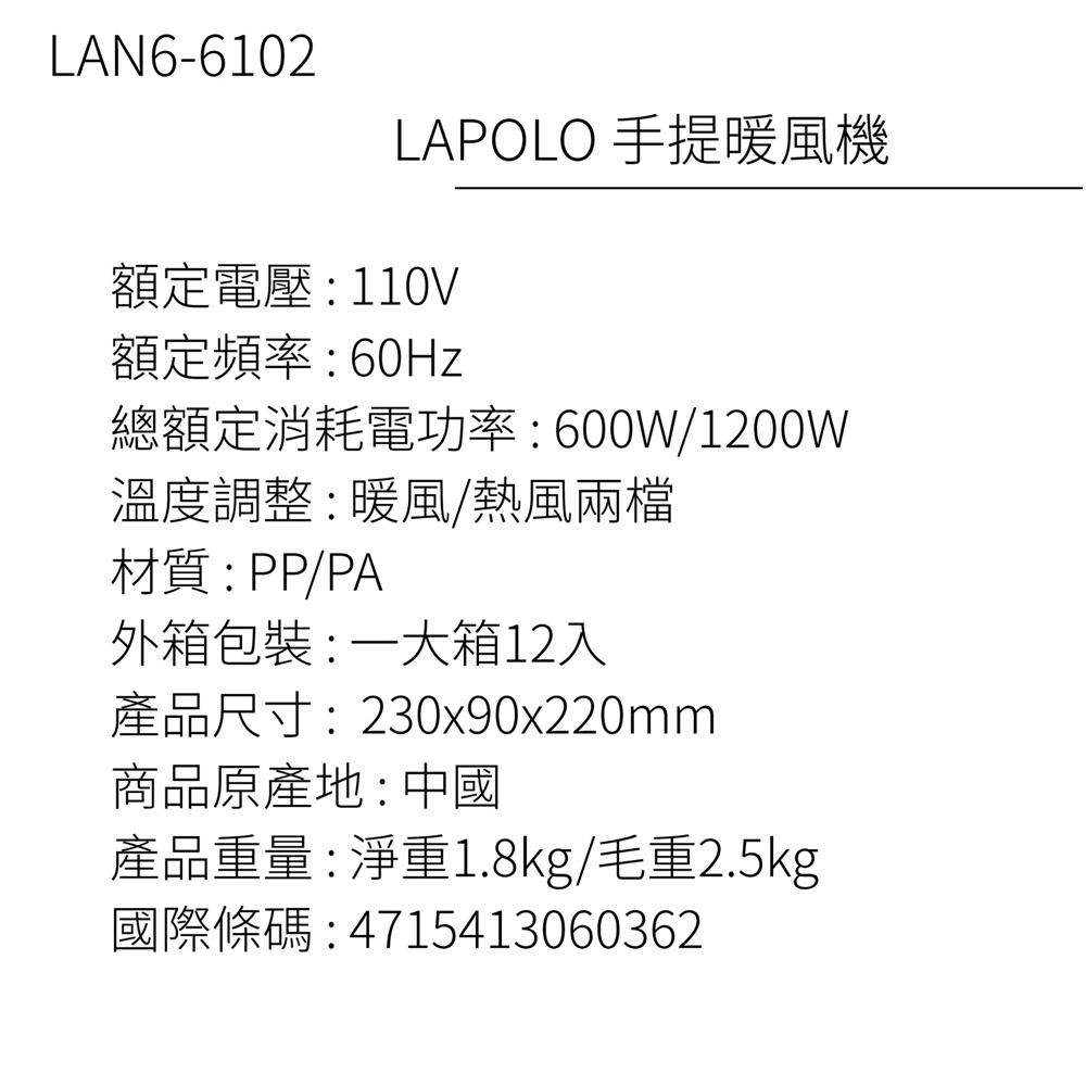 ◆消費權益◆■ 鑑賞期並非"試用期"。■ 退貨商品需是「全新商品」且「包裝完整」,包括外箱、包材、贈品等原廠所有配件,缺件、刮傷皆不同意退換貨。■ 大型家電一經拆箱定位安裝、插電及使用後,除原廠鑑定為商品問題外,不得以其他個人理由退換貨。■ 商品簽收前請務必確認商品型號、顏色正確,一經簽收即代表同意,不得以其他個人理由退換貨。■ 對商品有疑慮的地方請務必先詢問,能接受再訂購!■ 商品送達後若因買家因素無法安裝或拒收,買家需負擔賣家出貨產生的物流費用商品特色:可站立、可臥躺,輕鬆隨意安放內建智能恆溫,溫度持續加溫新型合金發熱體,散熱快、壽命長廣角送暖冬天裡迅速驅走寒冷商品規格:型號:LAN6-6102產品尺寸:230x90x220mm產品重量:1.8kg電壓(V/Hz):110V/60HZ可設溫度:否最大/最小消耗功率:1200W/600WBSMI許可字號:R43650產地:中國保固:1年本商品資訊由網路及官網收集彙整而成,僅供參考,如有更新或異動不另外通知,正確商品資訊及規格以實機為準。鑑賞期非試用期,產品一經拆箱、插電及使用皆會影響您退貨權利。