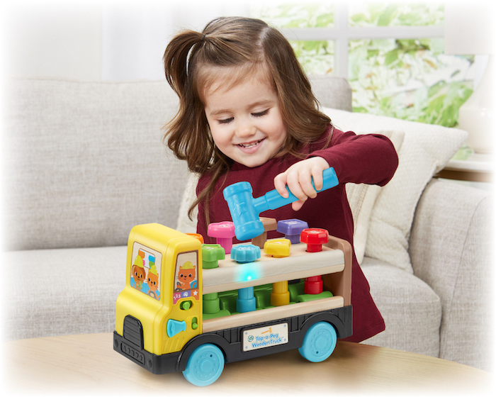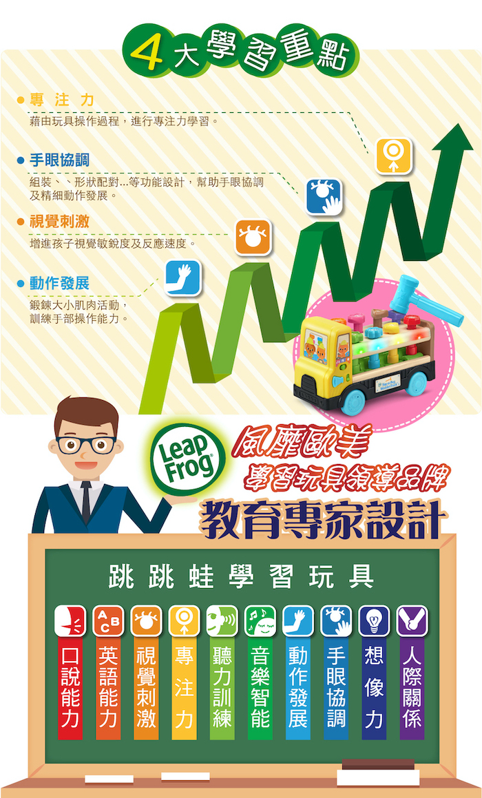 ●卡車上有八種形狀、顏色及數字●三種模式,數字、顏色、形狀,敲打任一柱子,會隨機發出英文單字●喇叭按鍵,有生動的音樂及互動式遊戲。依照巴士發出的指示,敲擊正確的數字、顏色或形狀。結束時會亮燈宣布分數●槌子可放置於卡車下方,方便收納●輪子為滾動式設計,孩子可推著卡車,訓練大肌肉●材質是由FSC™ 認證的木材製成,品質保證又安心●多元學習主題-數字/顏色/形狀/手腳部小肌肉/字母