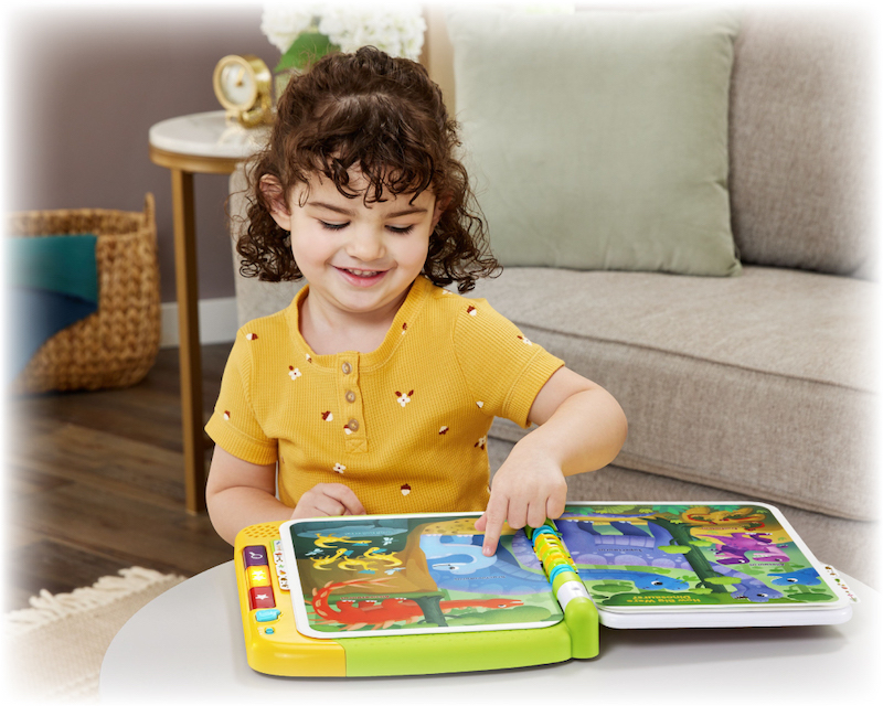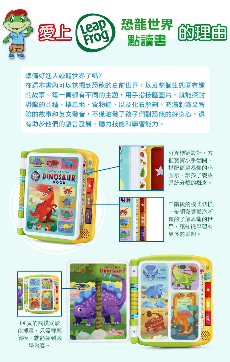 答對了!替自己歡呼一下!按下音符按鍵,三首輕快的英文歌曲中,也能聽到恐龍的名字,更能加深印象。LeapFrog 學習專家 Mollie Levin文學碩士說:恐龍世界點讀書每一頁充滿刺激又冒險的故事和英文發音,